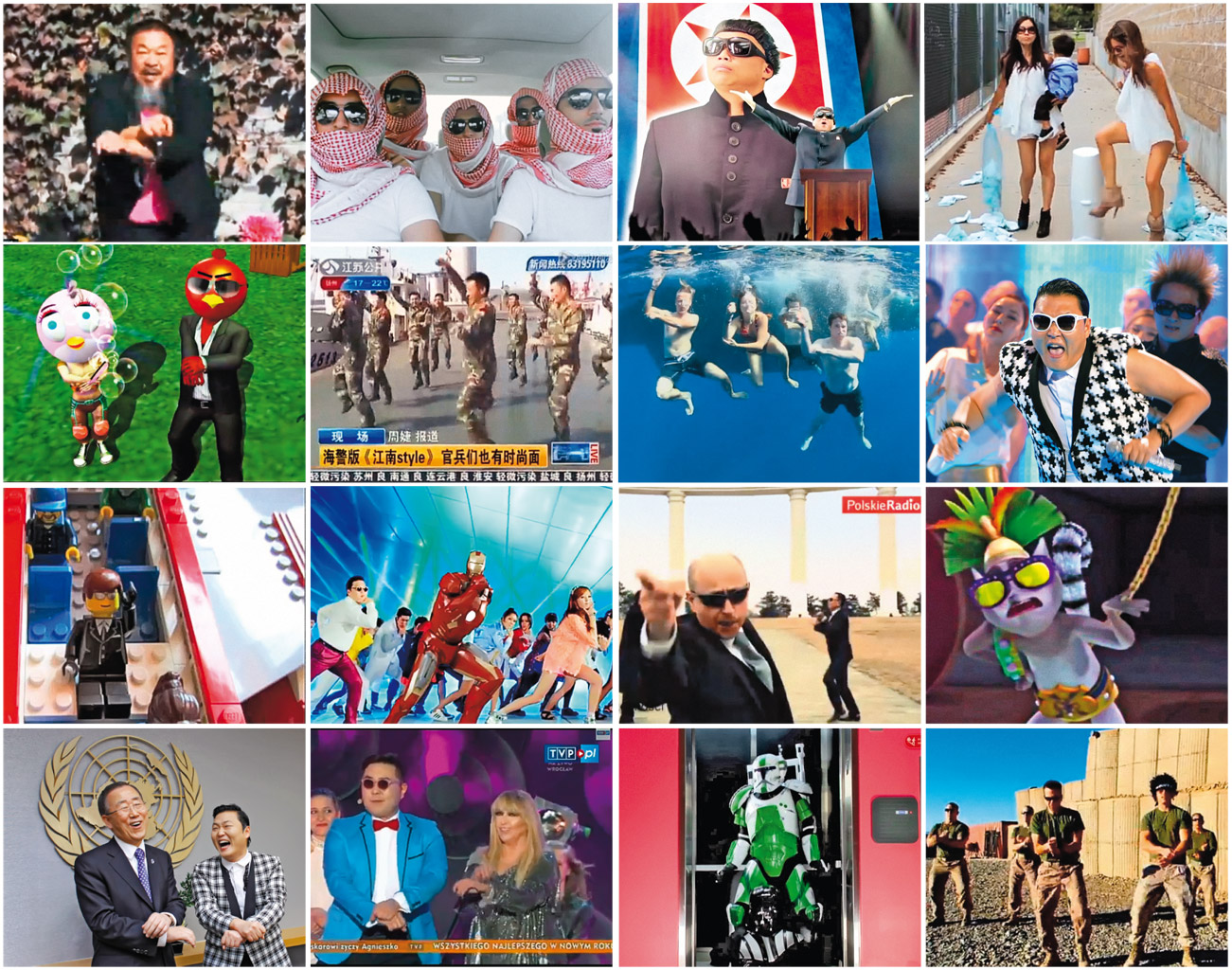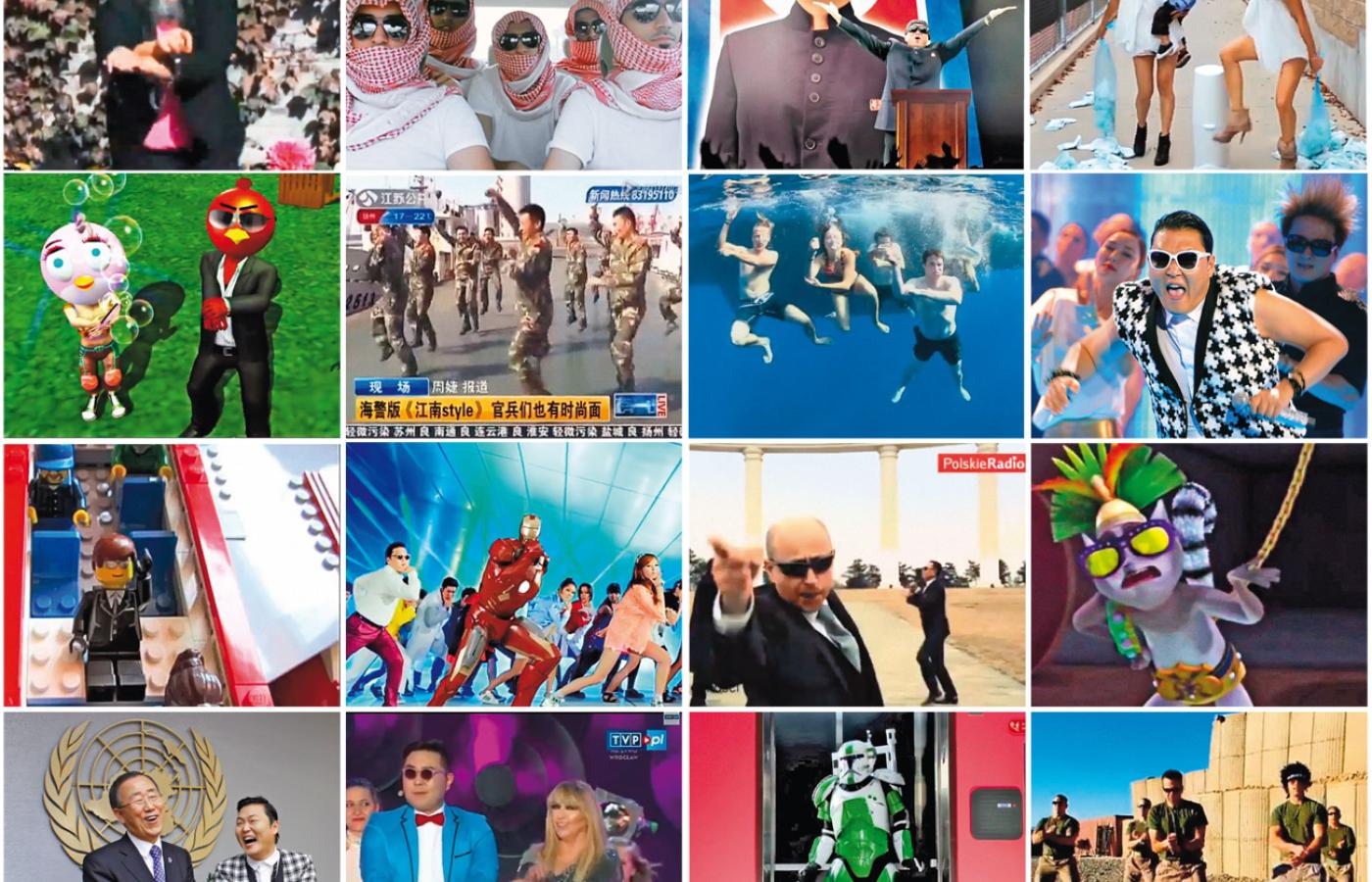 Pseudonim autora (Psy – wymawia się sai) stał się najczęściej wyszukiwanym słowem w sieci, a jego film – najczęściej parodiowanym. Oprócz tysięcy amatorów własną wersję tańca w stylu Gangnam zaprezentowało NASA, Greenpeace, marynarki wojenne USA i Chin, a nawet wykładowcy uznanych uczelni wyższych z MIT na czele. Słynny chiński artysta Ai Weiwei uprawiał końskie podskoki w kajdanach, nawiązując do swego pobytu w więzieniu. Gdy władze usuwały plik ze wszystkich lokalnych portali, Korea Północna promowała własny materiał, w którym twarz pląsającego Psy zastąpiło oblicze Park Geun-hye, nowej prezydent Południa. Niewidzialnego rumaka ujeżdżał przed kamerą amerykański ambasador w Warszawie i polski ambasador w Pekinie. Do prywatnej nauki kroków przyznali się David Cameron i Barack Obama. Globalna Psy-choza objęła jednak przede wszystkim zwykłych ludzi. Na zbiorowe wykonania „Gangnam” w Mediolanie, Paryżu czy Rzymie ściągało po 15–20 tys. osób.