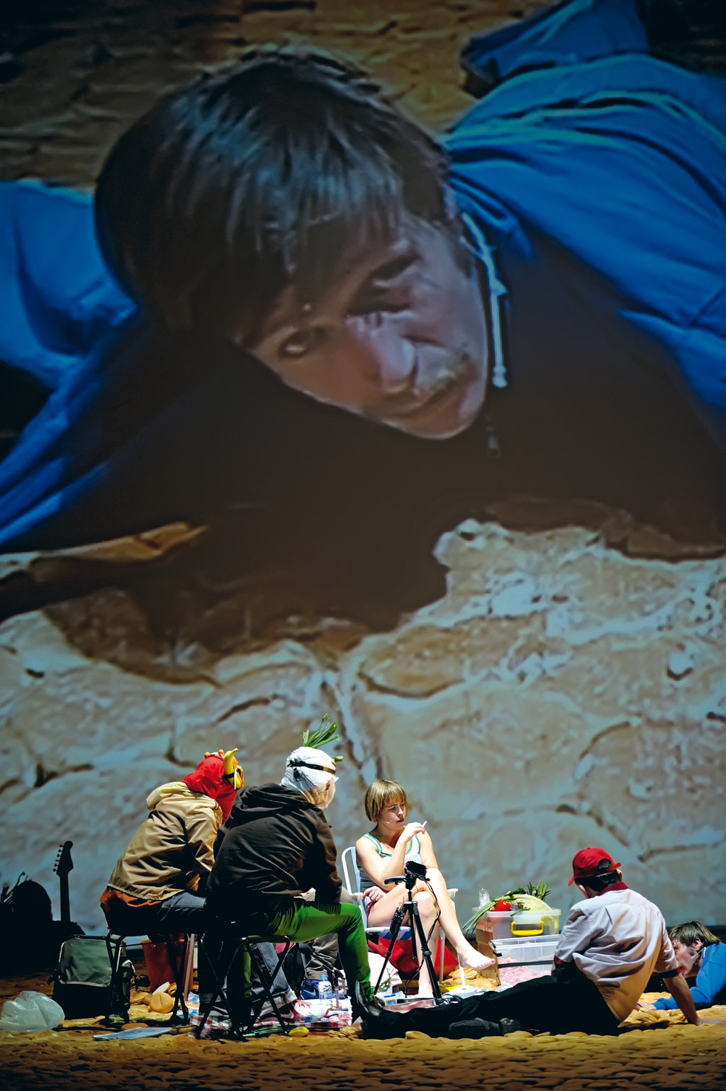 O co to całe halo? Na scenie pokrytej bułkami na hamburgery piątka aktorów odbywa piknik. Opalając się i jedząc, prowadzą filozoficzne dyskusje, nierzadko dowcipne i ironiczne, i inscenizują własne wersje klasycznych obrazów religijnych. „Jedyną pewną rzeczą, jaką posiadacie, jest wasza samotność, jesteście na granicy całkowitego upadku” – oto punkt wyjścia spektaklu, który ma ambicje sportretowania współczesnej, chylącej się ku upadkowi cywilizacji konsumpcji i hedonizmu.