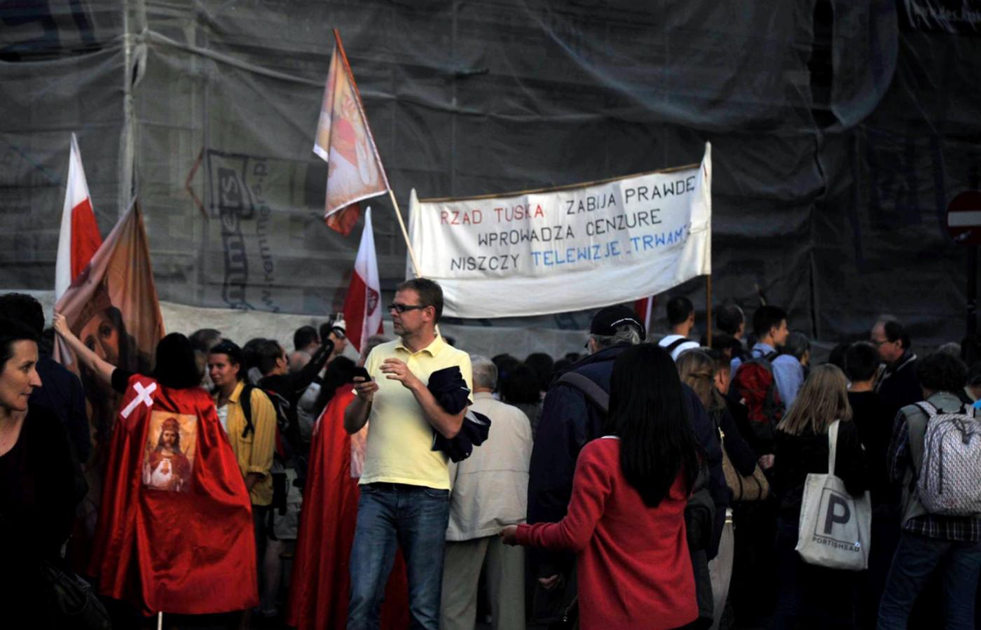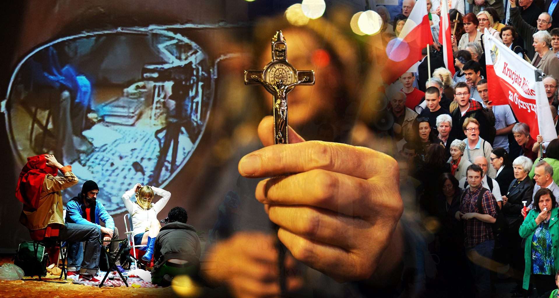 Obok transparentów Krucjaty Różańcowej za Ojczyznę widniały znaczki Radia Maryja. Na warszawskim placu Defilad zorganizowane przez Teatr Studio czytanie scenariusza m.in. przez aktorów TR Warszawa i Tomasza Karolaka zagłuszać próbowała kilkusetosobowa grupa z gwizdkami, syrenami, w użyciu obok litanii był także Hymn.