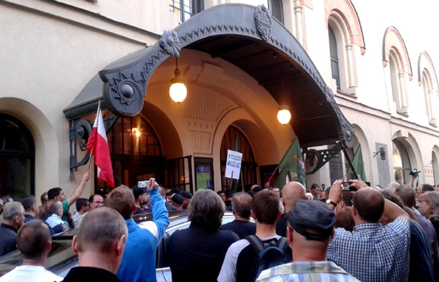 W Teatrze Lalki i Aktora Pinokio w Łodzi tłum protestujących z różańcami, portretami Jezusa Chrystusa i Jana Pawła II udaremnił czytanie scenariusza.