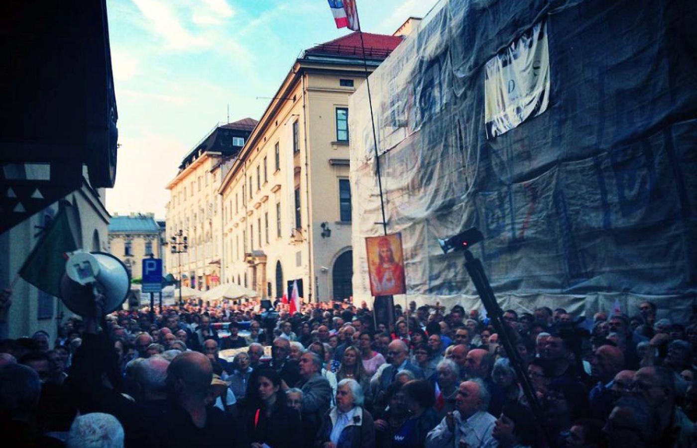 W Krakowie przed Starym Teatrem protestujący trzymali transparent z napisem „Kościół walczący” i skandowali: „Wielka Polska katolicka”, „Nie pozwól nikomu rządzić w swoim domu”. Protestowało około 500 osób.