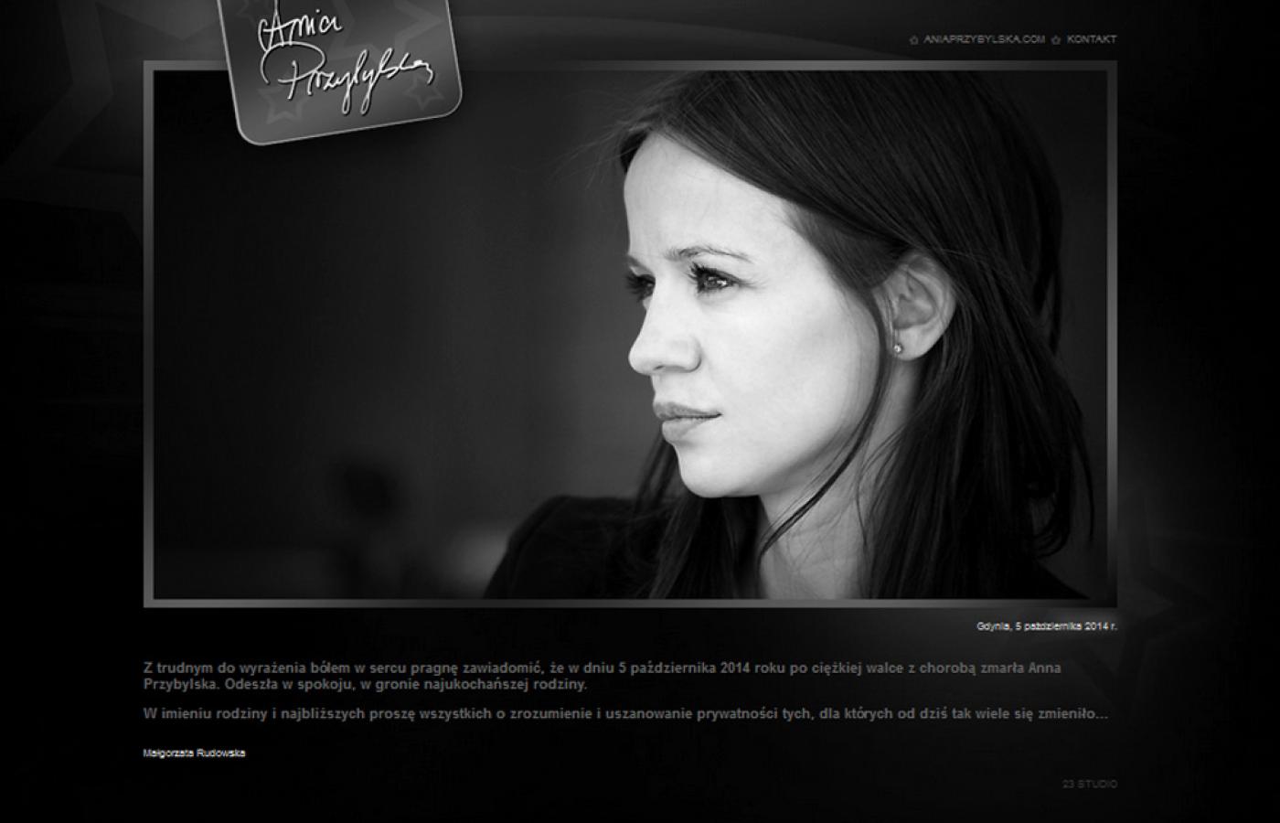 Informacja o śmierci niespełna 36-letniej aktorki została zamieszczona na jej oficjalnej stronie. „Z trudnym do wyrażenia bólem w sercu pragnę zawiadomić, że w dniu 5 października 2014 roku po ciężkiej walce z chorobą zmarła Anna Przybylska. Odeszła w spokoju, w gronie najukochańszej rodziny. W imieniu rodziny i najbliższych proszę wszystkich o zrozumienie i uszanowanie prywatności tych, dla których od dziś tak wiele się zmieniło...” – czytamy w oświadczeniu menadżerki Małgorzaty Rudowskiej.