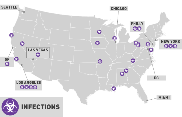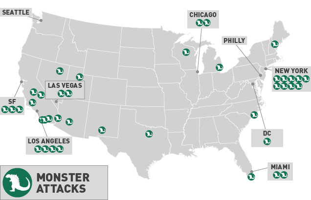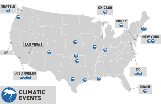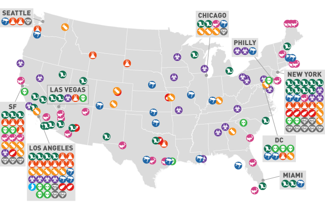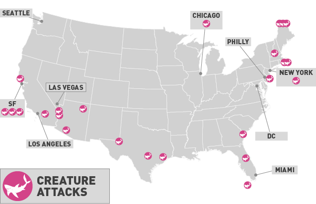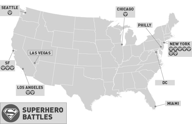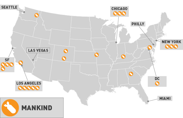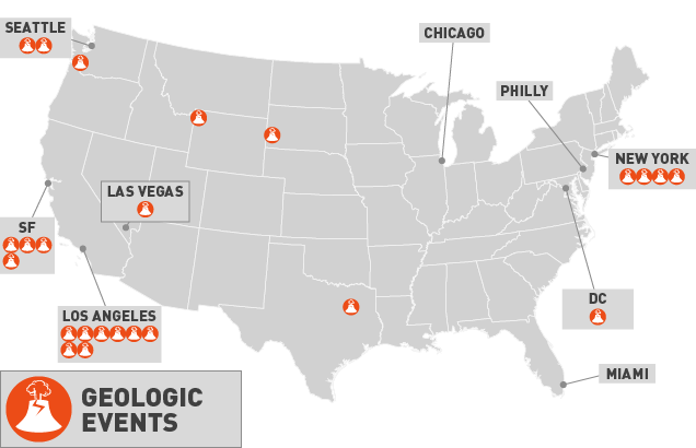 Fischer-Baum i Kalaf odszukali w sumie blisko 200 kataklizmów, które przytrafiły się Stanom Zjednoczonym na dużym ekranie. Przez „kataklizm” rozumieją przy tym najróżniejsze katastrofy i zdarzenia zarówno realistyczne (epidemie, wybuchy wulkanów, anomalie pogodowe), jak i z pogranicza science fiction (najazd obcych sił, wojny superbohaterów). Najczęściej doświadczanym miastem okazuje się Nowy Jork.