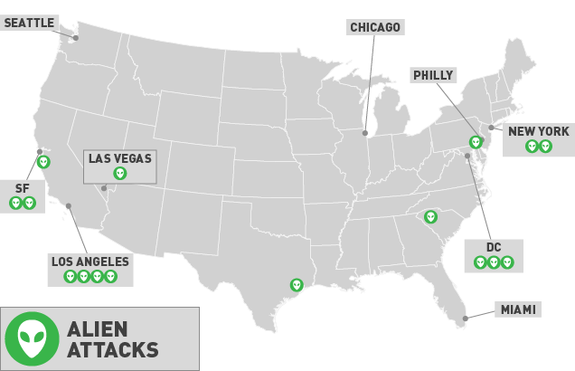 I przybysze z innych planet niszczą Amerykę. Zwłaszcza największe miasta: Nowy Jork, Los Angeles i Waszyngton.