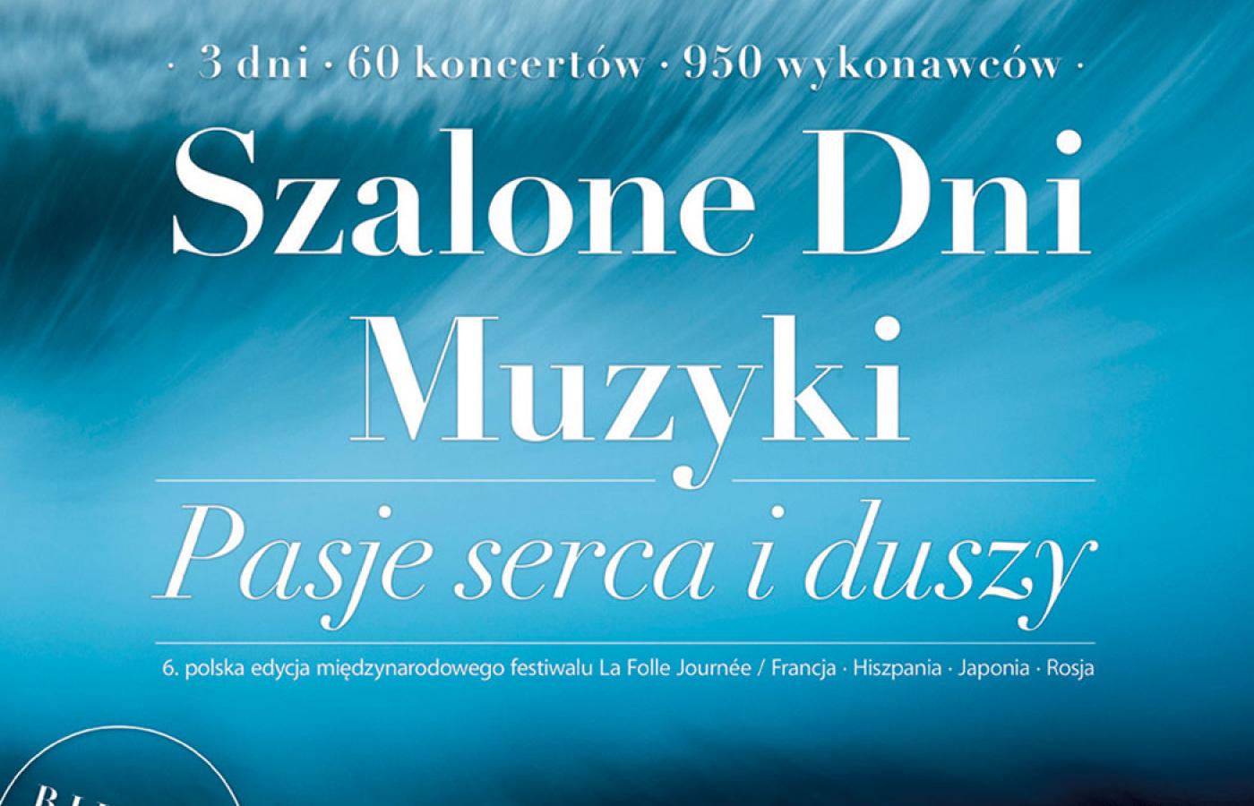 Inaczej niż w poprzednich latach tegoroczna, szósta polska edycja Szalonych Dni Muzyki, w ramach której w salach Opery Narodowej wystąpi 950 artystów na 60 koncertach, nie jest poświęcona muzyce poszczególnych kompozytorów czy epok. Będzie można na niej usłyszeć dzieła Bacha i Beethovena, Schumanna i Szostakowicza, Verdiego i Góreckiego. Co je łączy? Wyrażanie intensywnych emocji. To pretekst, by usłyszeć np. tanga Piazzolli w wykonaniu sekstetu samego Richarda Galliano, Pasji wg św. Jana obchodzącego właśnie 80. urodziny Arvo Pärta w interpretacji estońskiego zespołu Vox Clamantis, III Symfonii Henryka Mikołaja Góreckiego z sopranistką norweską Maritą Solberg czy też utworów Beethovena i Brahmsa z udziałem laureata II nagród na konkursie chopinowskim i konkursie im. Czajkowskiego, Lukasa Geniušasa. To tylko niektórzy soliści; wystąpią też świetne zespoły kameralne, jak Quatour Modigliani, Haba Quartett i Arte dei Suonatori; z orkiestr – oczywiście Sinfonia Varsovia, organizator festiwalu, oraz orkiestra Opery Narodowej, Polska Orkiestra Radiowa i Filharmonia Narodowa. Silny jak co roku będzie nurt edukacyjny: spotkania z artystami, liczne koncerty dla najmłodszych melomanów z cyklu Smykofonia (z udziałem m.in. Marcina Maseckiego i Zdzisława Piernika) oraz występy uczniów szkół muzycznych w namiocie festiwalowym ustawionym przed teatrem.