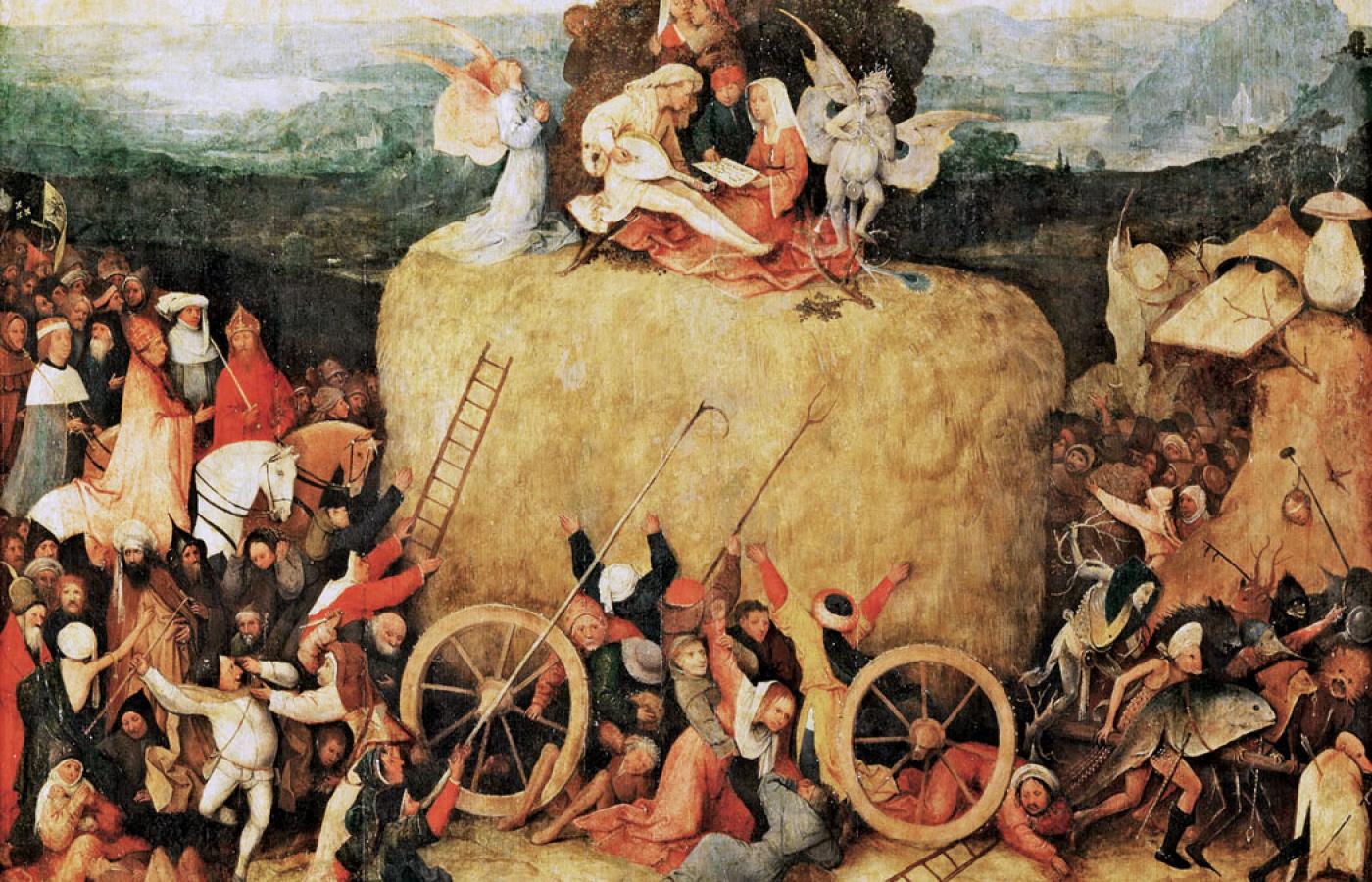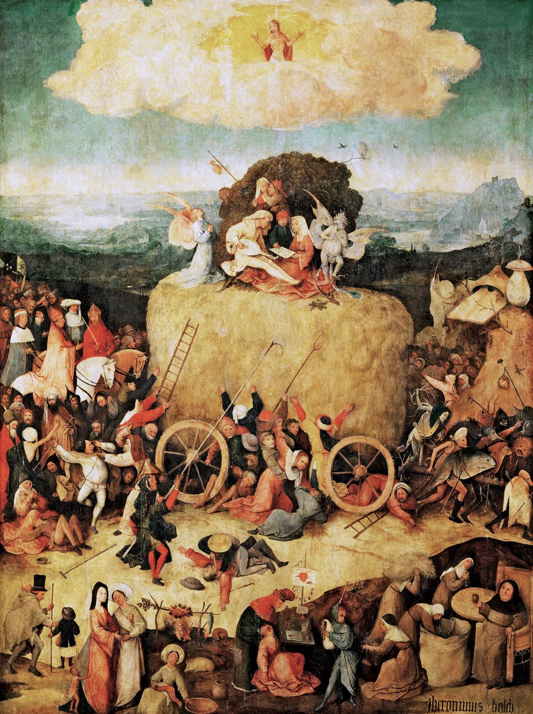 W największym uproszczeniu dorobek Boscha można podzielić na dwie części. Pierwsza to dość konwencjonalne, utrzymane w duchu epoki malarstwo nawiązujące stylistycznie i tematycznie do osiągnięć słynnych tzw. prymitywistów flamandzkich, na czele z Janem van Eyckiem, Petrusem Christusem, Hansem Memlingiem i Rogierem van der Veydenem. Obrazy, które – można powiedzieć – trzymają się malarskiej tradycji swoich czasów: „Adoracja dzieciątka”, „Wędrowiec”, „Leczenie głupoty”, „Kuglarz”, „Ukrzyżowanie”, „Ołtarz Epifanii”, a nawet – choć już z lekkim odlotem – „Statek głupców” i „Niesienie krzyża”.