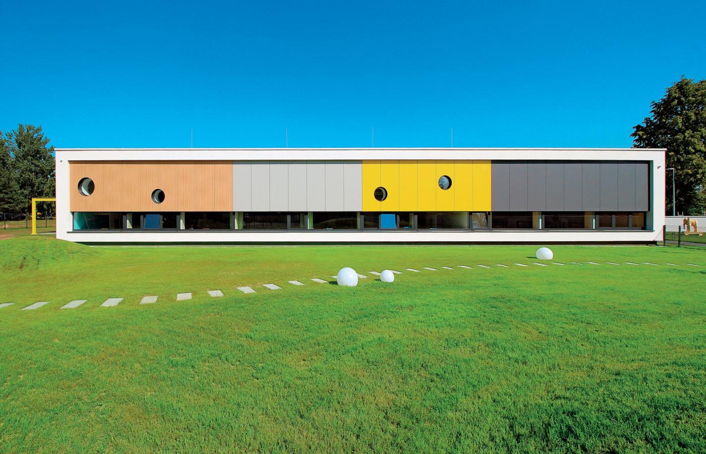 Rozłożysty parterowy budynek ma kształt podkowy, co sprawia, że wewnątrz powstało wyjątkowo przyjemne patio z piaskownicą i zielenią. Wokół jest zresztą kilka placów zabaw, a dodatkowe możliwości aranżacji przestrzeni do zajęć z dziećmi dają ażurowy pawilon letni oraz duża altana. Kameralny charakter całości, okna dostosowane do wzrostu dzieci, duże przeszklenia, logiczny układ funkcjonalny sprawiają, że dzieci mogą czuć się tu jak w domu. Za pomocą składanych ścian można regulować powierzchnię pomieszczeń i dostosowywać ich wielkość do bieżących potrzeb.