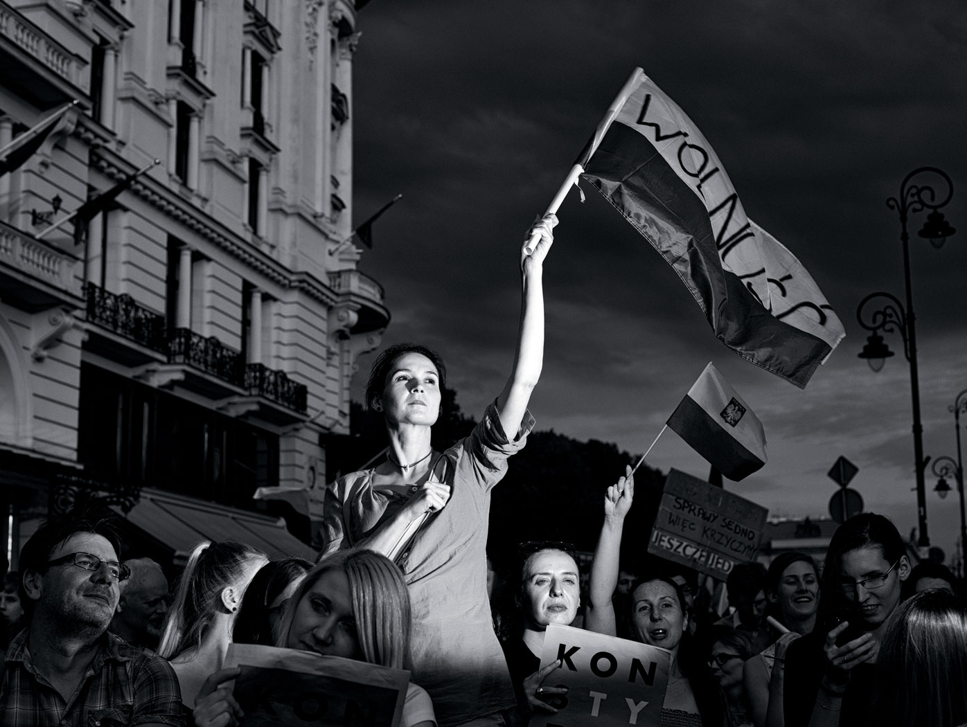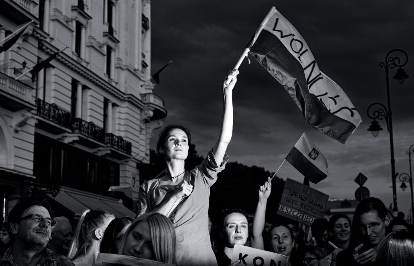 Tłum pod Pałacem gęstniał. Podobnie zresztą jak atmosfera. Koło godz. 21 czuło się, że ludzie są u szczytu emocji, że brakuje iskierki, żeby żarty – „wyjdź do nas albo my przyjdziemy po ciebie” – przestały być żartami. Monika skandowała, machała flagą. Nie pamięta, w którym momencie zorientowała się, że jest fotografowana. Pewnie zwróciła uwagę na błysk flesza, bo już się ściemniało. Fotograf robił jej zdjęcie za zdjęciem, ale specjalnie się nie przejmowała, bo czuła, że wokół dzieje się coś dużo ważniejszego. Następnego dnia prezydent zawetował dwie z trzech ustaw niszczących autonomię polskich sądów. A następnie, kiedy opadły emocje i ludzie pojechali na wakacje, dorżnął sądy dokładnie tak, jak próbowano to zrobić w zawetowanych wcześniej ustawach. Czego Monika nie zamierza mu nigdy zapomnieć.