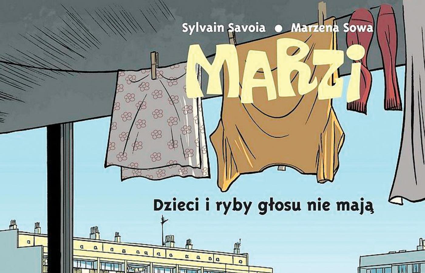 Połączenie osobliwości, absurdu, nostalgii i niepokoju jest znajome wielu ludziom, którzy doświadczyli małego końca pewnego świata, entropii na gruzach utopii” – pisała Olga Drenda w „Duchologii polskiej” o epoce ustrojowej transformacji. Album „Marzi. Dzieci i ryby głosu nie mają” (Egmont, 4/6) świetnie ten stan odzwierciedla, nawet jeśli opowiada o czasach nieco wcześniejszych. Marzena Sowa wraca do lat dzieciństwa upływającego w cieniu stanu wojennego, narodzin Solidarności oraz pogłębiającego się kryzysu. Ale wielka historia schyłku peerelowskiej smuty dzieje się w tle, miga na ekranie czarno-białego telewizora. Ilustracje Sylvaina Savoi nadają tej wyprawie w przeszłość nieoczekiwanych barw: pełnych życia nawet wtedy, gdy w serca bohaterów wkrada się lęk o przyszłość.