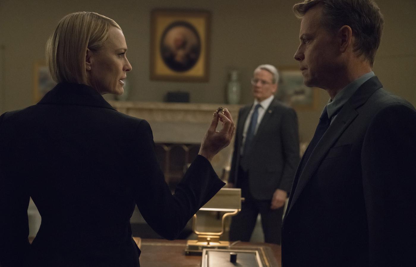 Także wybór Kevina Spacey do głównej roli kongresmena z Karoliny Północnej i rzecznika dyscypliny partyjnej demokratów, który mści się za niedotrzymaną przez prezydenta obietnicę teki ministerialnej, był znaczący. Aktora od lat łączyła zażyłość z Clintonami, w serialowym gabinecie Franka uważne oko mogło zauważyć zdjęcie, na którym aktor ściska się z Billem.