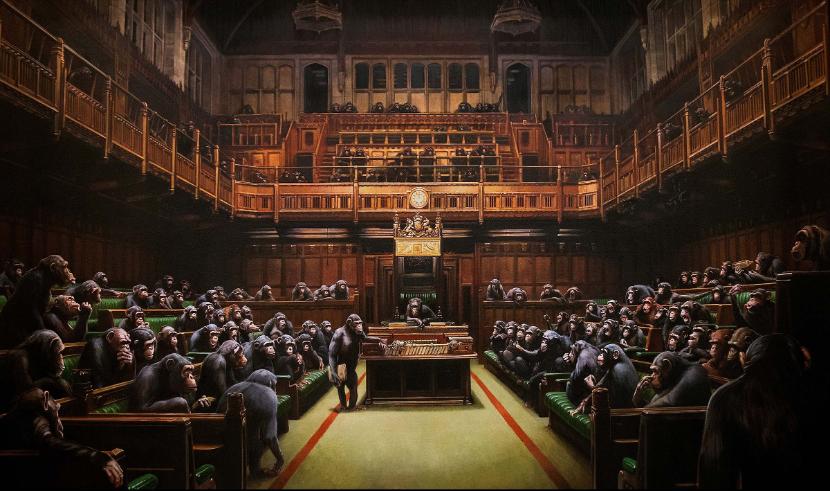 Inna praca Banksy’ego, „Devolved Parliament”, zyskała niejako drugie życie. Artysta stworzył ją 10 lat temu w zupełnie innym kontekście, kiedy nikt na poważnie nie myślał o brexicie. Niedawno pracę wystawiono ponownie w Bristol Museum jako komentarz do tego, co się działo (i dzieje) w parlamencie wokół brexitu. „Devolved Parliament” to największa znana praca Banksy’ego na płótnie. Przedstawia Izbę Gmin, w której w ławach miejsce polityków zajęły… szympansy.
