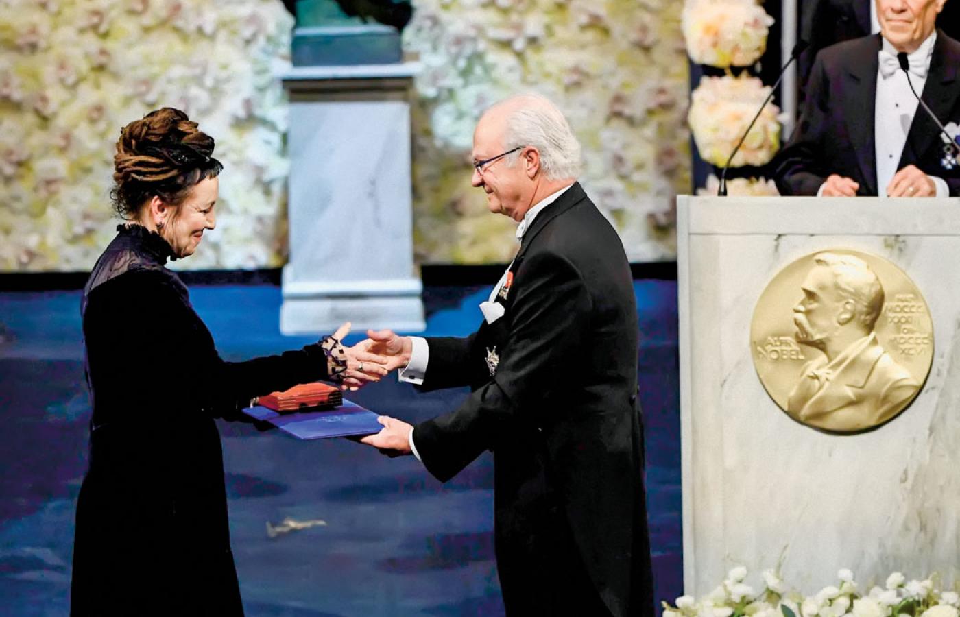Był też moment grozy – gdy w zamieszaniu zniknął medal noblowski. Kiedy po ceremonii podeszła do Tokarczuk z gratulacjami rodzina (grupę Tokarczuk tworzyli: mąż Grzegorz Zygadło, syn Zbyszko Fingas, psycholog z wykształcenia, jego partnerka, tłumaczka z czeskiego Anna Wanik, asystentka Iryna Wikyrczak, Ireneusz Grin, dyrektor Wrocławskiego Domu Literatury, z córką, i reżyserka Agnieszka Holland), okazało się, że medal zniknął.