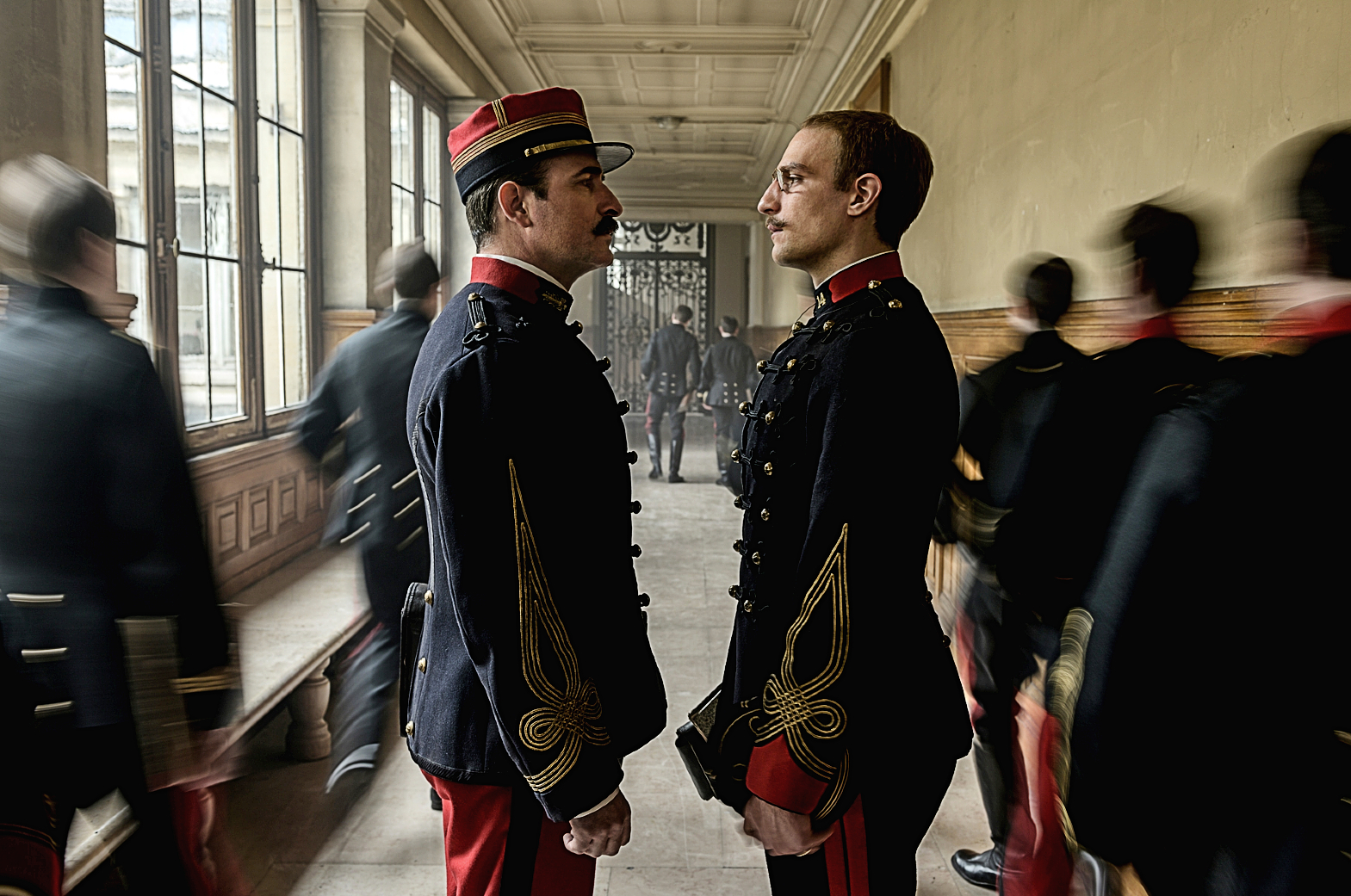 „Oficera i szpiega” otwiera znakomicie nakręcona scena degradacji Dreyfusa: zimna, beznamiętna, budząca ciarki. Rytuał zrywania pagonów i łamania szabli przypomina tu egzekucję – zresztą w prawnym i moralnym sensie nią jest. Dreyfusa świetnie gra Louis Garrel – gdy krzyczy „Skazaliście niewinnego!”, na jego twarzy malują się jednocześnie rozpacz, strach, duma i rozczarowanie.