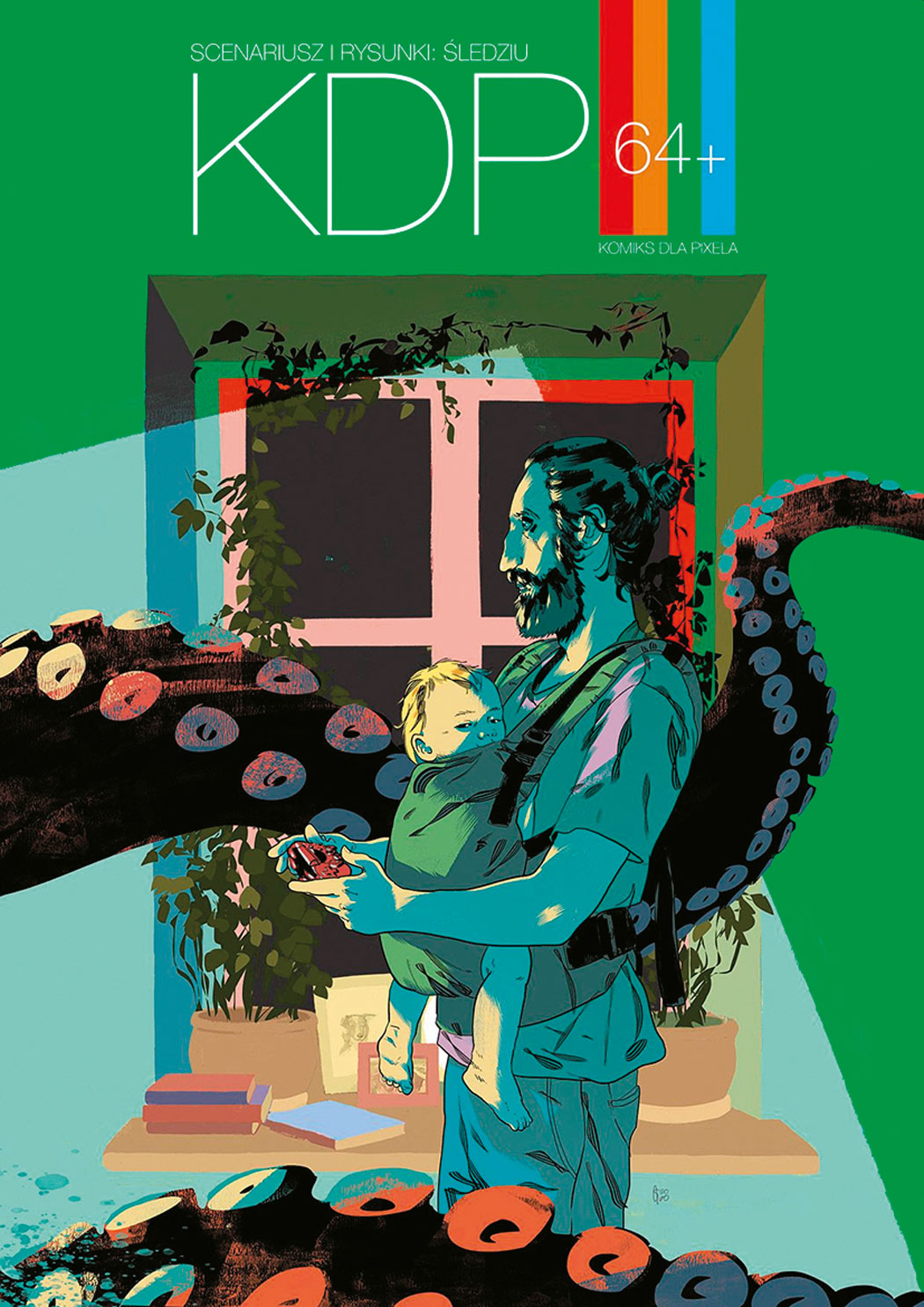 Za skrótem „KDP 64+” (Pixel, 5/6) kryją się jednoplanszówki rysowane przez Michała „Śledzia” Śledzińskiego dla magazynu „Pixel”, lecz wbrew pozorom ich zbiór jest lekturą nie tylko dla graczy. Co prawda w historyjkach często pojawiają się mniej lub bardziej znane tytuły gier wideo, jednak Śledziu wychodzi poza ramy hermetycznej anegdoty. Ma wielkie poczucie humoru, dystans do własnej twórczości i znakomity warsztat, które sprawiają, że w jego komiksach – często bardzo osobistych, układających się wręcz w rodzaj graficznego pamiętnika – odnajdą się wszyscy czytelnicy podobnie jak autor rozdarci między codziennym „poważnym” życiem a niezmierzoną miłością do popkultury.