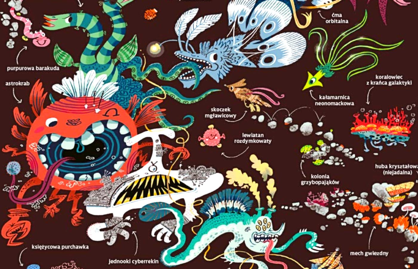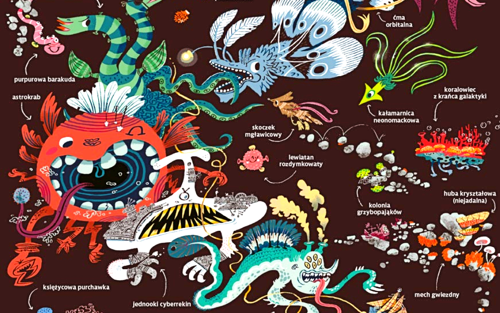 Kiedy po raz pierwszy sięgniemy po nową książkę Przemka Liputa, możemy przeżyć delikatny percepcyjny szok. Artysta, tworząc ją, zachorował chyba na jakieś przewlekłe horror vacui. Rozmach stworzonego przez niego świata, zamiłowanie do detalu, liczba elementów znajdujących się na poszczególnych rozkładówkach sprawi, że złapiemy się za głowę i nie będziemy w stanie od razu przetworzyć wszystkich smaczków, które nam zaserwował. Ale to tak naprawdę zaleta, bo każda kolejna lektura pozwala odkryć nowe rzeczy. Kosmiczna galaktyka Liputa jest pełna twórczej nonszalancji, surrealizmu i abstrakcyjnego humoru. Wbrew pozorom w książkach dla dzieci wcale nie trafia się to aż tak często.