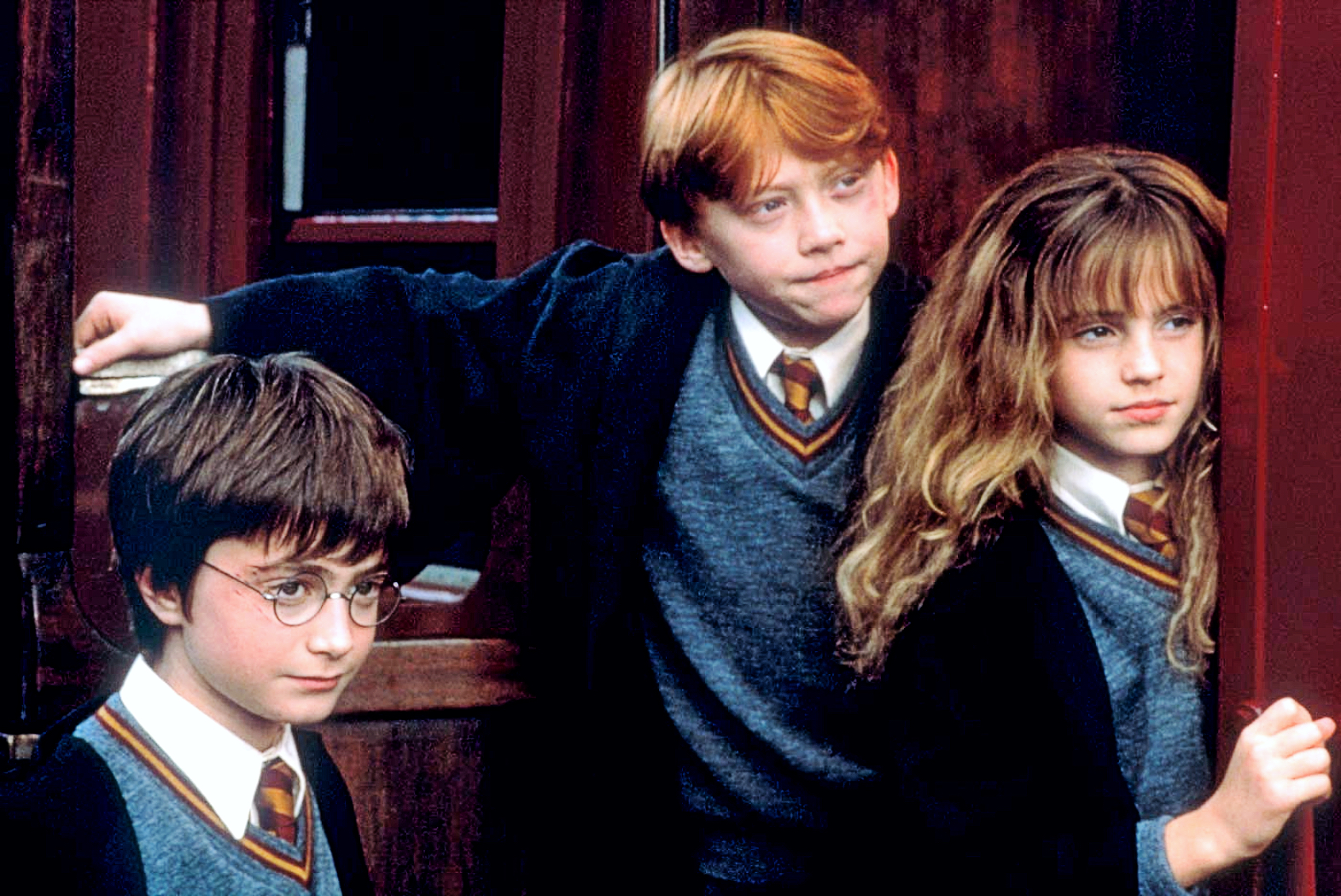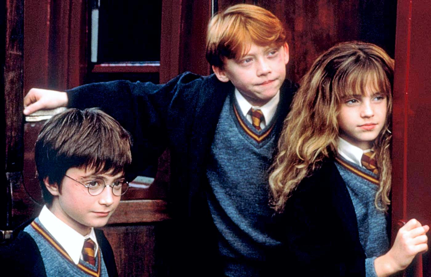 Najtrudniej było obsadzić trójkę głównych bohaterów. Rolę Hermiony Granger dostała zaangażowania od najmłodszych lat w szkolne przedstawienia Emma Watson, której nazwisko podsunęła agentom nauczycielka aktorstwa z Oksfordu. W rudowłosego Rona wcielił się Rupert Grint, który dostał się na przesłuchanie dzięki oryginalnemu nagraniu wideo: swoją motywację do roli zarapował. Daniel Radcliffe (przyszły Harry Potter) nie brał udziału w castingu. Reżyser i scenarzysta przypadkowo spotkali jego ojca Alana w teatrze, do którego przyszedł razem z żoną i synem. Mimo oporów rodziców (bali się zainteresowania mediów) twórcom udało się spotkać z młodym aktorem, który od razu zrobił na nich ogromne wrażenie.