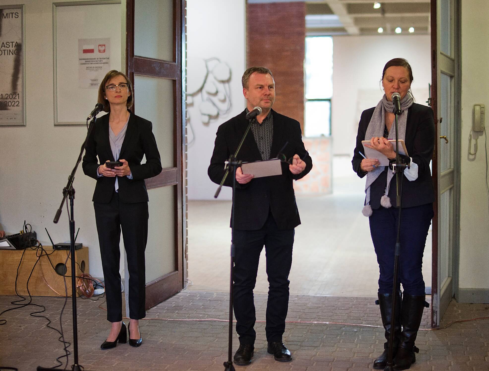 Wystawa „City Limits” w Centrum Rzeźby Polskiej w Orońsku, Muzeum Rzeźby Współczesnej, na zdjęciu: Barbara Schabowska – dyrektorka Instytutu Adama Mickiewicza oraz Sergio Edelsztein –kurator wystawy „City Limits”, na tle pracy Yael Efrati „bez tytułu” / „untitled”, 2021, media mieszane, wymiary zmienne, praca wykonana na warsztatach Centrum Rzeźby Polskiej w Orońsku