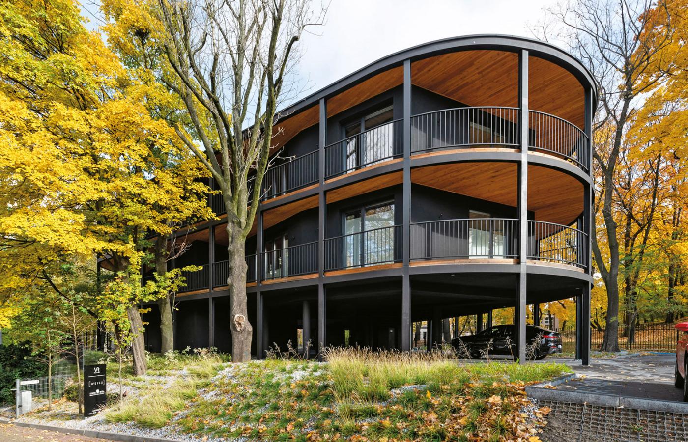 Ale przyjemność to także poczucie komfortu. Obiekt jest nieduży, składa się z ośmiu mieszkań umieszczonych na dwóch poziomach. Zaprojektowano je tak, by pomimo owej otwartości na przyrodę lokatorom zapewnić maksimum prywatności. Stąd całość podzielono na cztery segmenty z osobnymi wejściami, co sprawia, że na każdym piętrze jest wejście do jednego tylko mieszkania. Na uwagę zasługuje fakt, że ze wszystkich (!) pokoi można wyjść bezpośrednio na taras, a dzięki małemu wewnętrznemu dziedzińcowi dzienne światło dociera też do łazienek i przedpokoi. Budynek idealnie wpisuje się w otoczenie, jest elegancki, nieco staroświecki, minimalistyczny. Z wyczuciem połączono ciemny stalowy szkielet z jasnym drewnem tarasów. Ta realizacja stanowi ciekawy i nowy w rodzimych realiach pomysł na wielorodzinne zamieszkanie. Oryginalność projektu doceniono także za granicą. Otrzymał Grand Prix DNA Paris Design Awards 2021, Eurasian Prix oraz kilka nominacji do ważnych branżowych nagród.