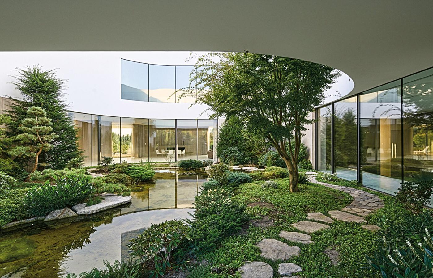 Architekt stanął więc przed nietypowym i trudnym zadaniem: dopasować się z projektowanym domem do gotowego ogrodu. Dodać trzeba, domem niemałym, bo liczącym 2 tys. m kw. I poradził sobie, nie po raz pierwszy zresztą, wyśmienicie. Parter budynku, na zasadzie mimikry, upodobnił się do otoczenia. Jego miękkie, owalne kształty idealnie pasują do lekko wijącej się dojazdowej drogi, kształtu stawu, linii układu ogrodowych roślin. Dodatkowo zaprojektowano atrium, które swą otwartością na ogród sprawia, że obie strefy: natury i architektury przenikają się i uzupełniają. Jednak już piętro willi ma zupełnie inny charakter i pomyślane zostało nie jako przedłużenie, ale jako kontrapunkt dla całej reszty. To wyrazista, choć elegancka prostokątna bryła, prywatna część rezydencji, która po zamknięciu okiennic sprawia wrażenie niedostępnej twierdzy.