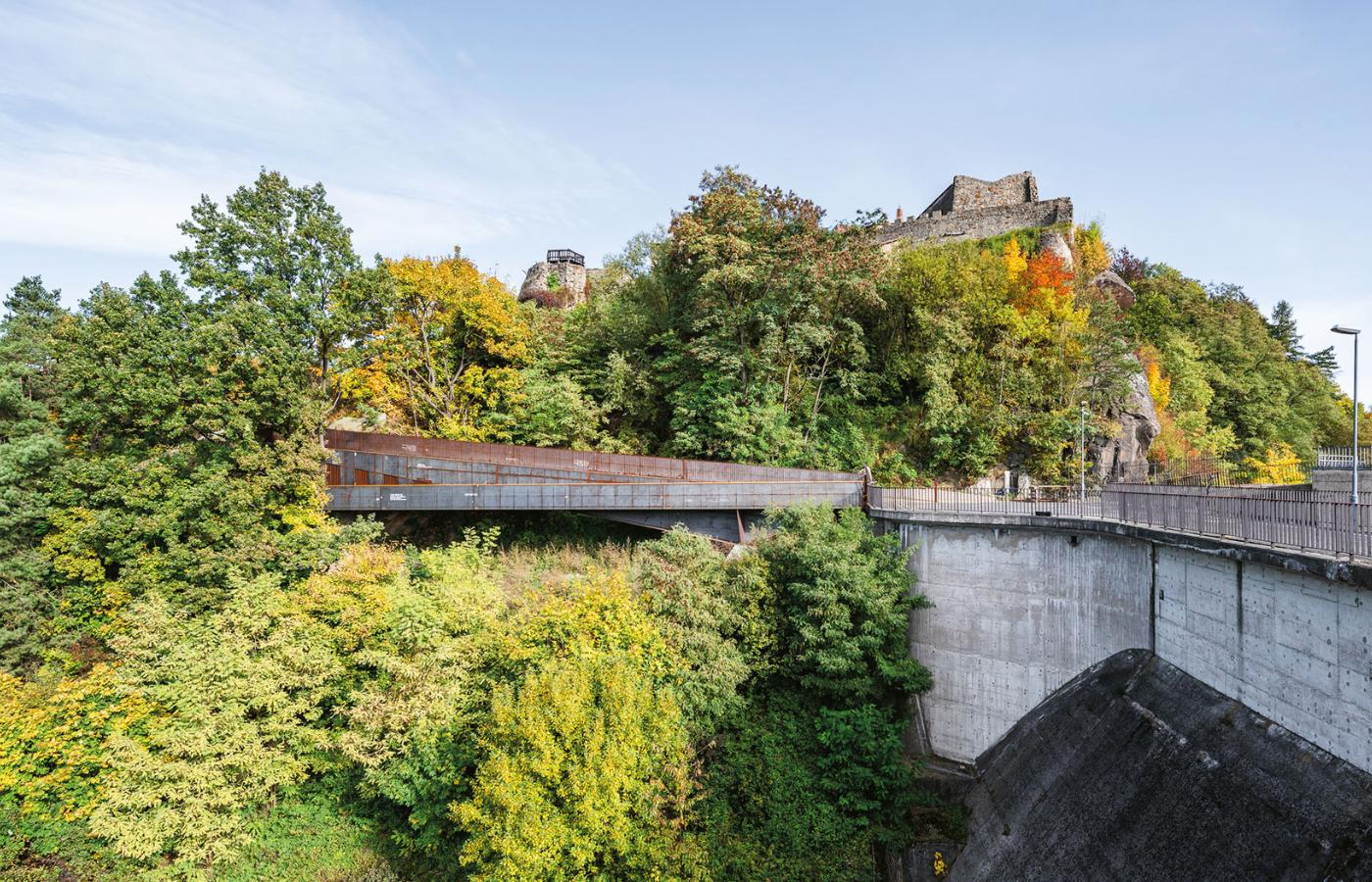 W ten sposób powstały… dwie kładki: bardziej stroma, piesza i łagodniejsza, rowerowa. Projektanci mieli do wyboru kilka opcji. Mogli stylistycznie odwołać się do zamkowych ruin, do drewnianego budownictwa, a nawet do geologicznych formacji skalnych zamkowej góry. Zdecydowali jednak za punkt odniesienia wziąć industrialną, surową architekturę samej zapory. Stąd minimalistyczne kształty, stalowo-żelbetowa konstrukcja i wykończenia ze stali kortenowskiej. Kładka nie próbuje wtopić się w zbocze, ale też nie epatuje swą obecnością. Jest wyrazista, ale nie nachalna. A dzięki jej budowie najbliższa okolica zyskała dodatkowe walory turystyczne.
