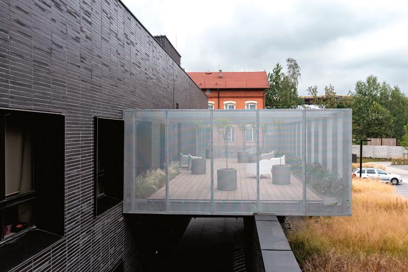 Dwa elementy zwracają szczególną uwagę. Po pierwsze – elewacja. Obłożono ją czarną klinkierową okładziną, której symboliczne nawiązanie do tradycji Górnego Śląska jest bardzo czytelne. Bryła nabrała elegancji, którą podkreśla jeszcze dobudowany obszerny balkon-taras otoczony jasną, ażurową, delikatną siatką. Duże lustrzane okna doskonale nawiązują relację z otoczeniem i szkoda tylko, że użytkownikowi zdarza się zasłaniać je autoreklamowymi banerami.