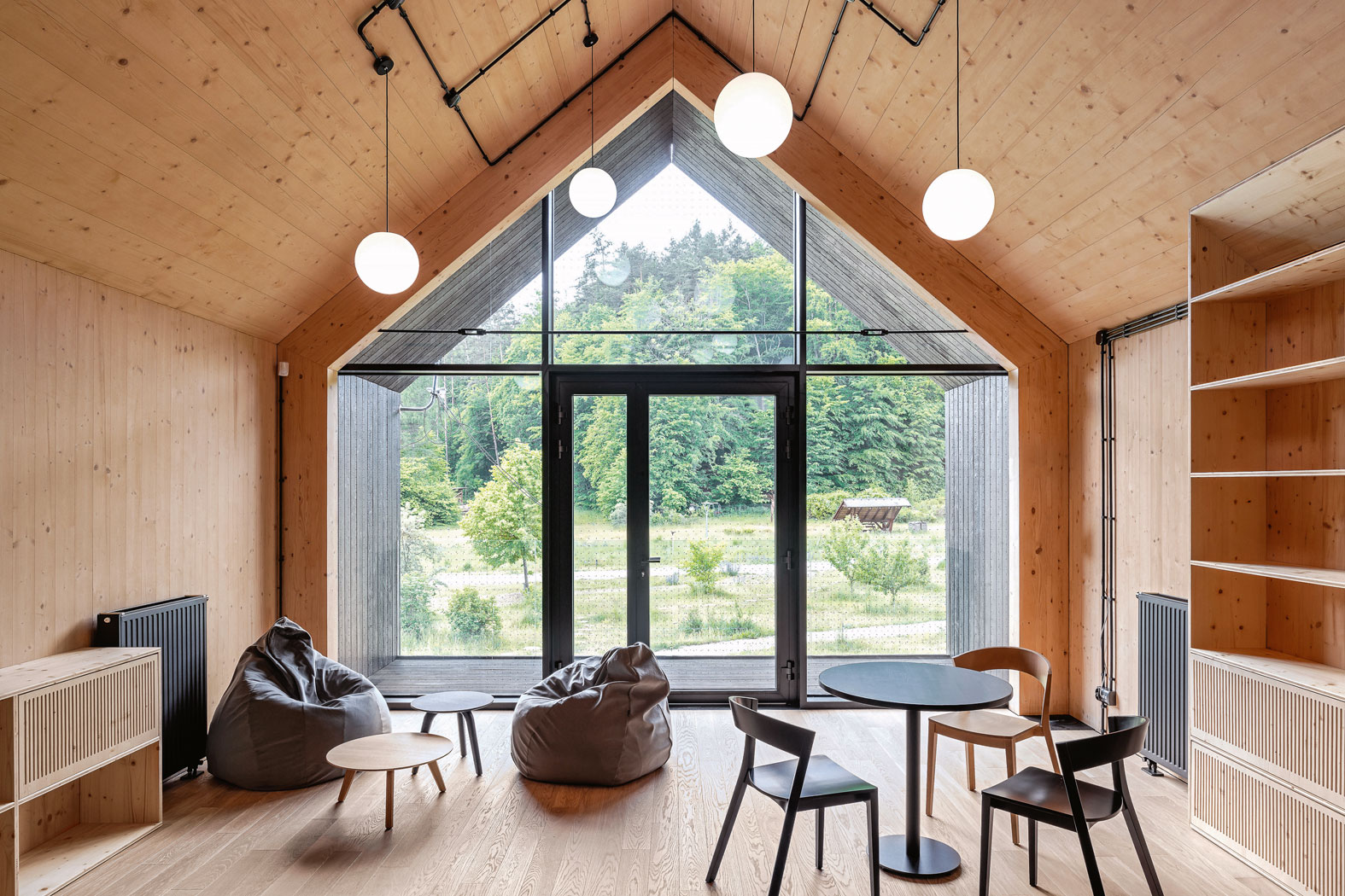 Technologia CLT jest coraz bardziej ceniona na świecie, ale po raz pierwszy zastosowano ją całościowo w polskim obiekcie użyteczności publicznej. Panele architekci uznali za na tyle wartościowe, że wyeksponowali je we wnętrzu, rezygnując z dodatkowego wykończenia. Postawili na industrialną estetykę, stąd wszelkie łączenia, przekroje przegród, jak i instalacji są dobrze widoczne. A zastosowane w pomieszczeniach drewno wpływa pozytywnie na komfort, kojarzy się z bezpieczeństwem. Pozostaje w kontraście z czarną, opalaną okładziną fasady, która pozwoliła wtopić obiekt w leśny pejzaż.