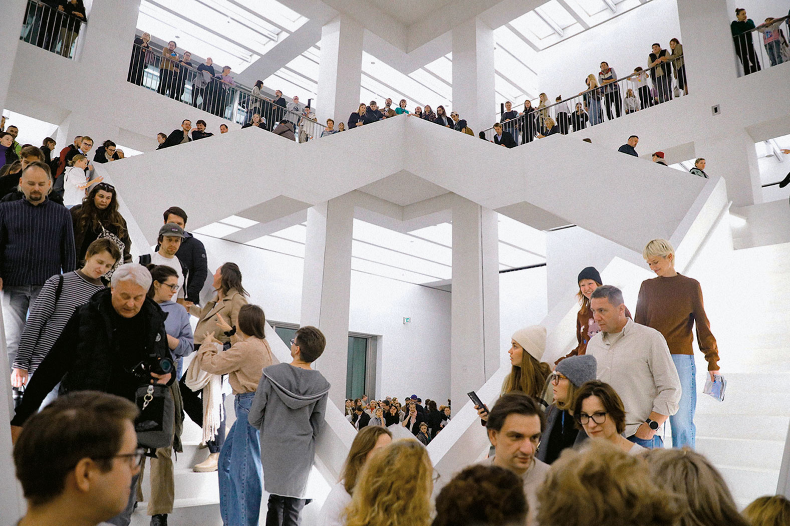 Wprawdzie oferta artystyczna była nietypowa i w sumie dość skromna – 10 zaprezentowanych prac, choć monumentalnych, i tak ginęło w wielkich białych kubikach ekspozycyjnych sal (na pierwsze pełnokrwiste wystawy trzeba będzie poczekać aż do lutego) – ale tym razem mniej szło o kontakt ze sztuką, a bardziej o społeczno-psychologiczny fenomen, o fiestę, wspólne świętowanie. Portale społecznościowe pulsowały od relacji, komentarzy, ocen i selfie na tle imponujących białych schodów.