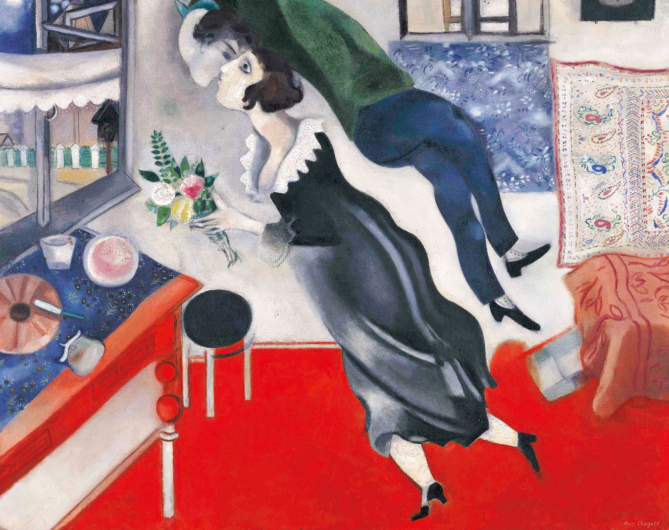 Empatię na pewno budzi filmowa wręcz historia jego miłości do Belli. Poznali się w 1909 r. i podczas pierwszego pobytu w Paryżu Chagall bardzo za nią tęsknił. Porzucił więc obiecująco rozwijającą się karierę, wrócił do Rosji, by wziąć z nią ślub. To był mezalians – Bella pochodziła z bardzo zamożnej rodziny, odebrała staranne wykształcenie, udanie zaczęła karierę akademicką i… aktorską. A śmierć Belli w 1944 r. z powodu głupiego braku dostępu do penicyliny (bakteryjne zapalenie gardła) każe nam patrzeć na Chagalla z dużą czułością. Na wystawie jest kilka prac, którymi upamiętnił ukochaną. Od efektownej „Mojej narzeczonej w czarnych rękawiczkach” (1909 r.), przez pełne lirycznego uniesienia „Urodziny” i „Podwójny portret z kieliszkiem wina” z lat 1917–18, po pożegnalną „Scenę wiejską (w cieniu marzeń)” z 1944.