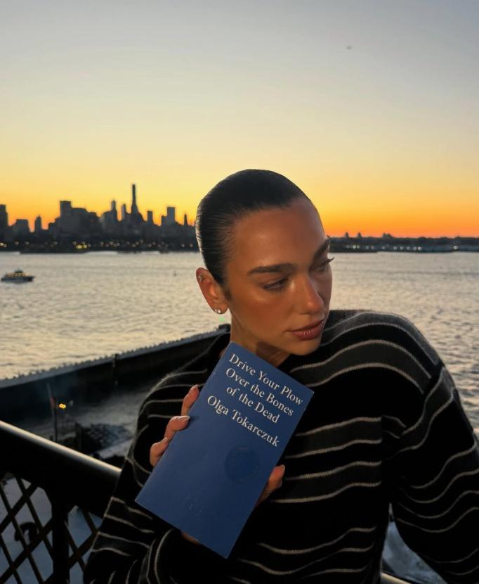 Na zdjęciu widać kobietę ubraną w czarny sweter w paski. Stoi nad wodą, w tle zachód słońca nad panoramą miasta. Nie patrzy w kamerę, a w dłoni trzyma książkę. To ona jest najważniejsza w tej kompozycji – „Drive Your Plow Over the Bones of the Dead” Olgi Tokarczuk, anglojęzyczne wydanie „Prowadź swój pług przez kości umarłych”. Kiedy wpadłem na to zdjęcie w mediach społecznościowych, pomyślałem dwie rzeczy – zaraz wszystkie portale napiszą o tym, że „piosenkarka Dua Lipa promuje polską noblistkę” oraz jak bardzo różni się od innych fotek przedstawiających książki na Instagramie.
