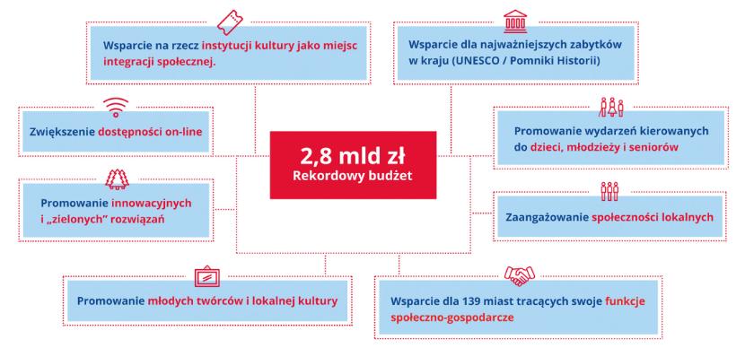 Dzięki funduszom europejskim możemy zrealizować wiele inwestycji, które dotychczas pozostawały jedynie w sferze planów. Odrestaurowaliśmy liczne zabytki, w tym m.in. zamki, muzea, teatry, rozbudowaliśmy i odremontowaliśmy szkoły i uczelnie artystyczne, powstały nowoczesne sale koncertowe, centra kultury i biblioteki, zakupiliśmy nowoczesne wyposażenie służące wzbogaceniu oferty kulturalno-edukacyjnej, a lokalne instytucje zyskały szansę, by konkurować z największymi ośrodkami. Co więcej, rozwój infrastruktury i bogatsza oferta przyczyniły się do wzrostu ruchu turystycznego i większej obecności polskiej kultury na arenie międzynarodowej.