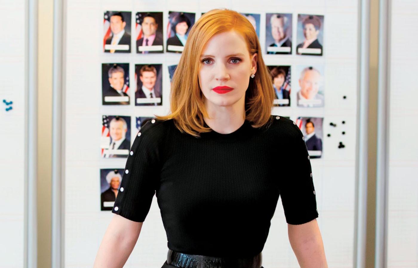 Jessica Chastain gra w „Sama przeciw wszystkim” waszyngtońską lobbystkę Elizabeth Sloane. Zgodnie ze stereotypem w intensywnej pracy zawodowej trzymają tę kobietę na nogach (w czarnych szpilkach) narkotyki. W ciągu dnia Sloane klnie też jak szewc, upokarza podwładnych i lobbuje za sprawami, w które osobiście nie wierzy. A w nocy, po bankietach wypełnionych negocjacjami z amerykańskimi senatorami, płaci kolejnej męskiej prostytutce, by „wyobrazić sobie życie, które porzuciła dla kariery”. Wiele słabszych aktorek poprzestałoby na przedstawieniu takiej wykrzywionej wizji kobiecego sukcesu, ale widać, że Chastain chce uczynić postać bardziej realistyczną – wypełnia ją równomiernie energią do działania i melancholią. Niestety, sam scenariusz debiutującego Jonathana Perery nie daje jej zbyt dużego pola manewru: nie wiadomo, co jest źródłem tego smutku, Sloane mówi tylko, że „dorastała zmuszona do kłamania”. Ta nieźle zagrana rola wyciąga więc na poprawny poziom całą opowieść, którą jednak z czasem (thriller trwa 132 minuty) pogrąża niewiarygodnie rozwijany wątek sensacyjny. Ze scenariuszem nie poradził sobie też John Madden, reżyser znany bardziej z pracy nad komediami „Zakochany Szekspir” czy „Hotel Marigold”. W „Samej przeciw wszystkim” Sloane decyduje się lobbować za ustawą zwiększającą kontrolę nad dostępem do broni w Stanach Zjednoczonych. Ta sprawa uznawana jest w Waszyngtonie za beznadziejną, bo choć większość opinii publicznej chce ograniczenia dostępu do uzbrojenia, to właśnie posiadacze pistoletów regularnie oddają głos w wyborach. „Lobbing to sztuka przewidywania” – tłumaczy więc Sloane przyjętą strategię, patrząc prosto w kamerę. Należy wyprzedzać ruchy przeciwnika i opracowywać środki zaradcze. Akcja filmu skupia się właśnie na pozbawionej moralnych hamulców rozgrywce między konkurującymi lobbystami. Przy czym wciąż aktualny w Stanach Zjednoczonych wątek zagrożeń, jakie niesie powszechny dostęp do broni, zostaje zepchnięty – podobnie jak motywacje bohaterki – na dalszy plan.