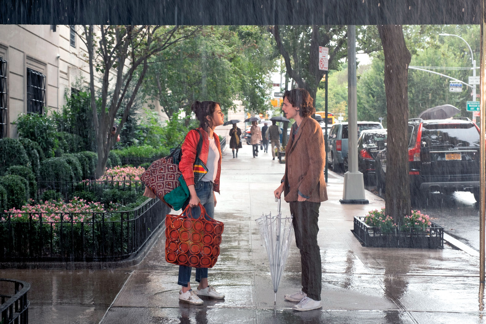Tworzy to mroczny kontekst dla filmu, w którym akurat Allenowi udało się mniej niż zwykle zagłębiać we własną neurozę. W filmie dominuje wątek komediowy wprowadzony przez Ashleigh (Elle Fanning), naiwną studentkę z Teksasu, która przyjeżdża do Nowego Jorku, by napisać artykuł o ambitnej produkcji filmowej. Nie potrafi zrezygnować z kolejnych ciekawych doświadczeń, jakie proponują jej podstarzali producenci tegoż dzieła, przez co czekający na nią chłopak Gatsby – imię znaczące, w tej roli Timothée Chalamet, czuje się porzucony. Ponieważ chce uniknąć odwiedzin u swoich bogatych i nudnych rodziców, zaczyna spacerować po mieście z ironiczną i trochę złośliwą Shannon (Selena Gomez). Allen, nieświadomy jeszcze realnych kłopotów z tym filmem, chciał w nim zawrzeć jakieś przemyślenia o pieniądzach, powielaniu błędów rodziców i swobodzie robienia tego, co się lubi. Wszystko to jednak wyparowuje z głowy szybciej niż deszczówka z rozgrzanych nowojorskich płyt chodnikowych.