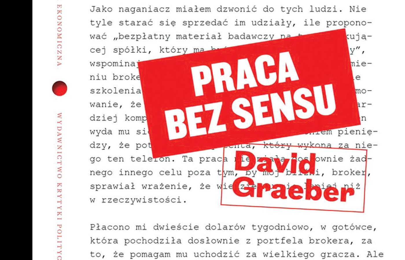 Epidemia bezużytecznych prac, o których nikt nie chce mówić – to główny temat trzeciej wydanej na polskim rynku książki Davida Graebera, antropologa z London School of Economics. Bazując na wynikach badań opinii publicznej w Europie Zachodniej, Graeber stara się dowieść, że duża część współczesnych stanowisk biurowych to tytułowe prace bez sensu (bullshit jobs – tak brzmiał oryginalny angielski tytuł książki), które zdaniem samych zatrudnionych nie mają żadnej wartości i mogłyby po prostu zniknąć. Chwilami autor specjalnie prowokuje czytelnika, by pobudzić go do myślenia.