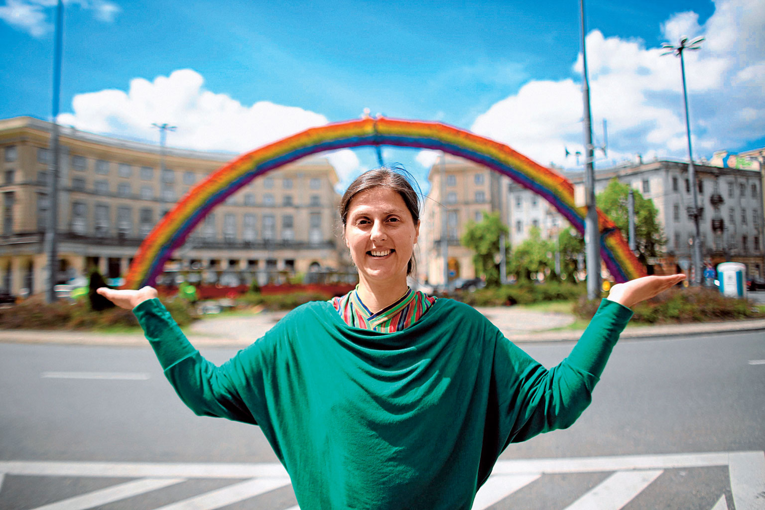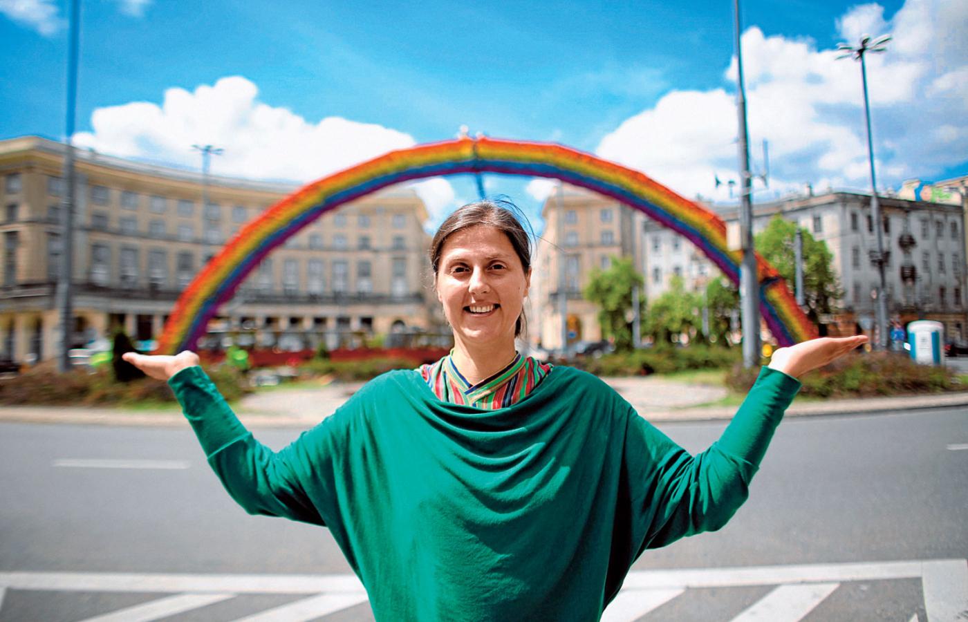 Ręczną robotę, domowe czynności podnosi mistrzowsko do rangi sztuki. W tym roku zrobiła to na wielką skalę, stawiając w samym centrum Warszawy ogromną tęczę utkaną z kwiatów przygotowanych wraz z dziesiątkami wolontariuszy. Postawiła ją między kościołem a modnymi knajpkami, tuż po Paradzie Równości. Tęcza stała się symbolem porozumienia i tolerancji, dlatego takie oburzenie wywołało jej podpalenie przez pijanych wandali — Agnieszka Kowalska.