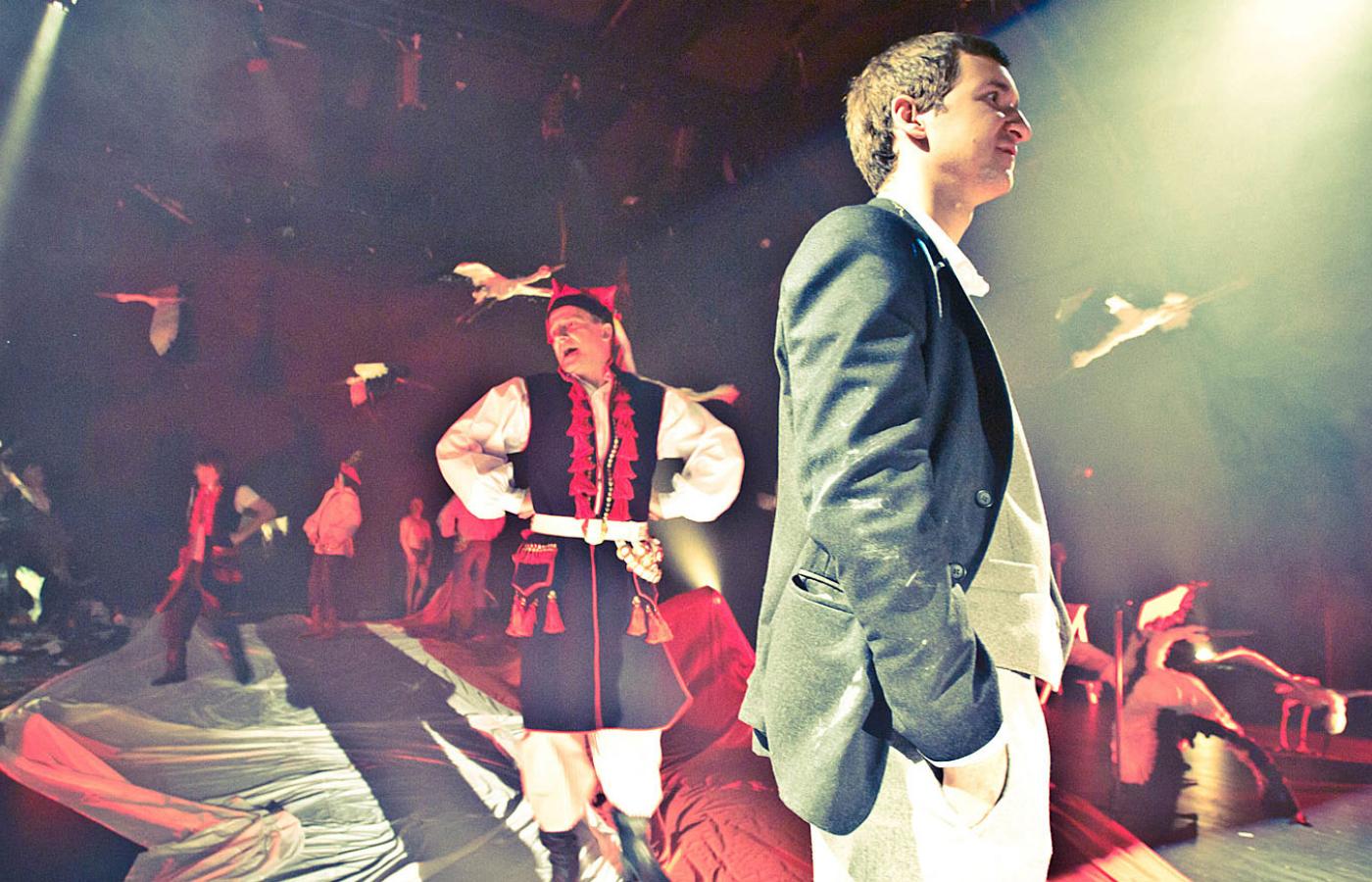 Tumidajski do powieści Gombrowicza z 1953 r., która brzmi, jakby była pisana wczoraj jako komentarz do polskiej wojny domowej po katastrofie smoleńskiej, dorzucił kilka mocnych scen. Jak licytowanie się patriotów na budujący narodową wspólnotę „czyn” (plucie na zdjęcie polityka, recytacja „Przesłania Pana Cogito”, ogłoszenie minuty ciszy), z nieodzowną w takich momentach baterią płonących zniczy w tle. W finale scenę przykryje biało-czerwona flaga, na niej patrioci w strojach krakowskich wykonają krakowiaka, który przemieni się w chocholi taniec. Gombrowiczom pozostanie rola bezsilnych obserwatorów, a młodzi utną łeb bocianowi i wyjadą z kraju.