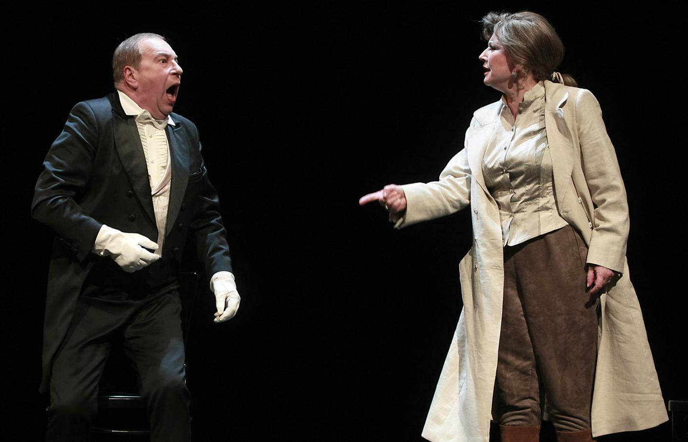 W „Niedźwiedziu”, z doklejoną brodą, w żołnierskim szynelu wciela się w wierzyciela – ordynusa w furii. W „Oświadczynach” jest nieśmiałym, omdlewającym hipochondrykiem, który wystrojony we frak próbuje sprostać wyzwaniu życia: prośbie o rękę sąsiadki. Ostatnia część spektaklu jest połączeniem „Impresaria pod kanapą” oraz „Pierwszego amanta” i dzieje się w aktorskiej garderobie. Stuhr w roli zmęczonego, starzejącego się aktora wygłasza wprost do publiczności patetyczną mowę pożegnalną. Czując, że jego teatr – kreacyjny, oddzielający sceniczną rampą sztukę od prawdziwego życia – zastępowany jest dziś przez teatr, który chce zburzyć rampę i być jak najbliższy życiu, decyduje się odejść.
