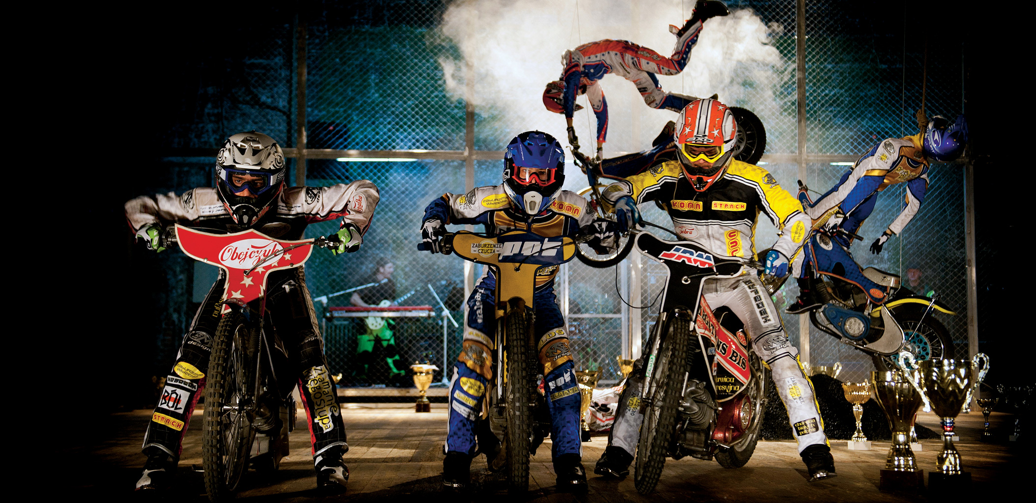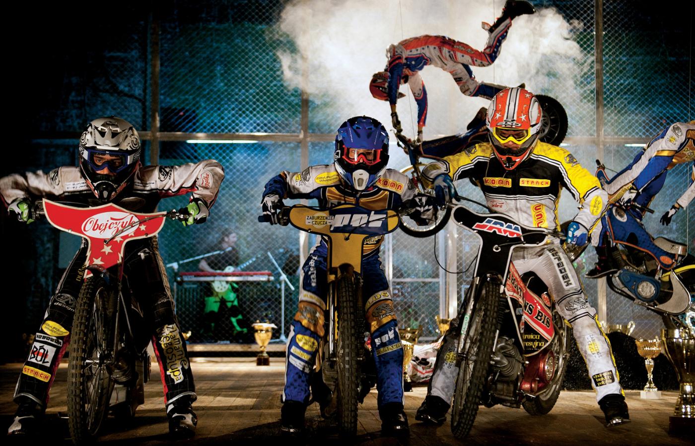 Opowieść o współczesnych szwoleżerach rozgrywa się, jak to w Polsce, na tle grobu-pomnika: obok żużlowego kopca leży figura zawodnika w kombinezonie i kasku, nad nią podwieszone są dwa motocykle i przelatujący nad nimi zawodnicy uchwyceni jednocześnie w chwili triumfu i śmierci. Zestresowani bohaterowie, poddawani nieustającej presji i zmuszani do najbardziej ryzykownych zachowań na torze: Mistrz (Mateusz Łasowski), Złamany (Michał Czachor) i Nowy (Piotr Żurawski) są od początku trupami – takie jest ich przeznaczenie, polska karma. Siłę bydgoskiego spektaklu osłabia tekst – zbudowany z gierek słownych i cytatów, nieprzekonujący.