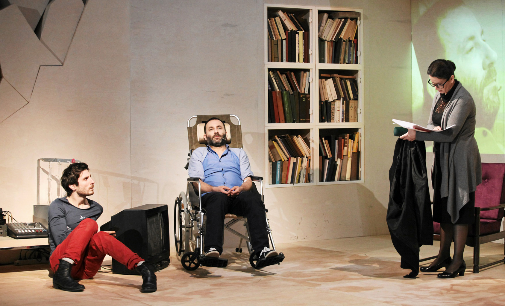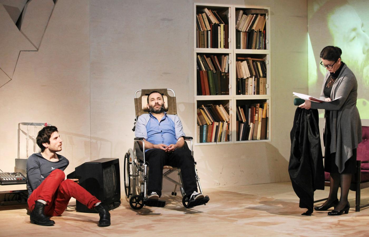 Z pomocą swojego młodego opiekuna/sobowtóra (Szymon Czacki) planuje samobójstwo – ma nawet specjalne urządzenie z kroplówkami do eutanazji. Wcześniej jednak zwołuje najbliższych, by – w ramach pożegnania – przeczytali z podziałem na role jego ulubioną sztukę, „Kordiana” Słowackiego. Ojciec (Jacek Romanowski) i matka (Beata Paluch), ksiądz (Zbigniew Ruciński) i była ukochana (Małgorzata Hajewska-Krzysztofik) czytają więc z kartek, potykając się o słowa wieszcza. Do tego momentu spektakl w Starym jest serią aktorskich etiud na temat: amatorzy zażenowani sztuczną sytuacją odgrywania ról oraz bliscy próbujący sobie poradzić z decyzją o samobójstwie Kordiana.