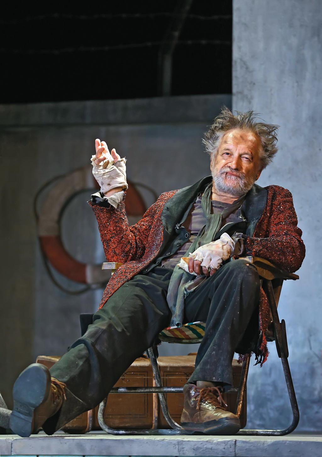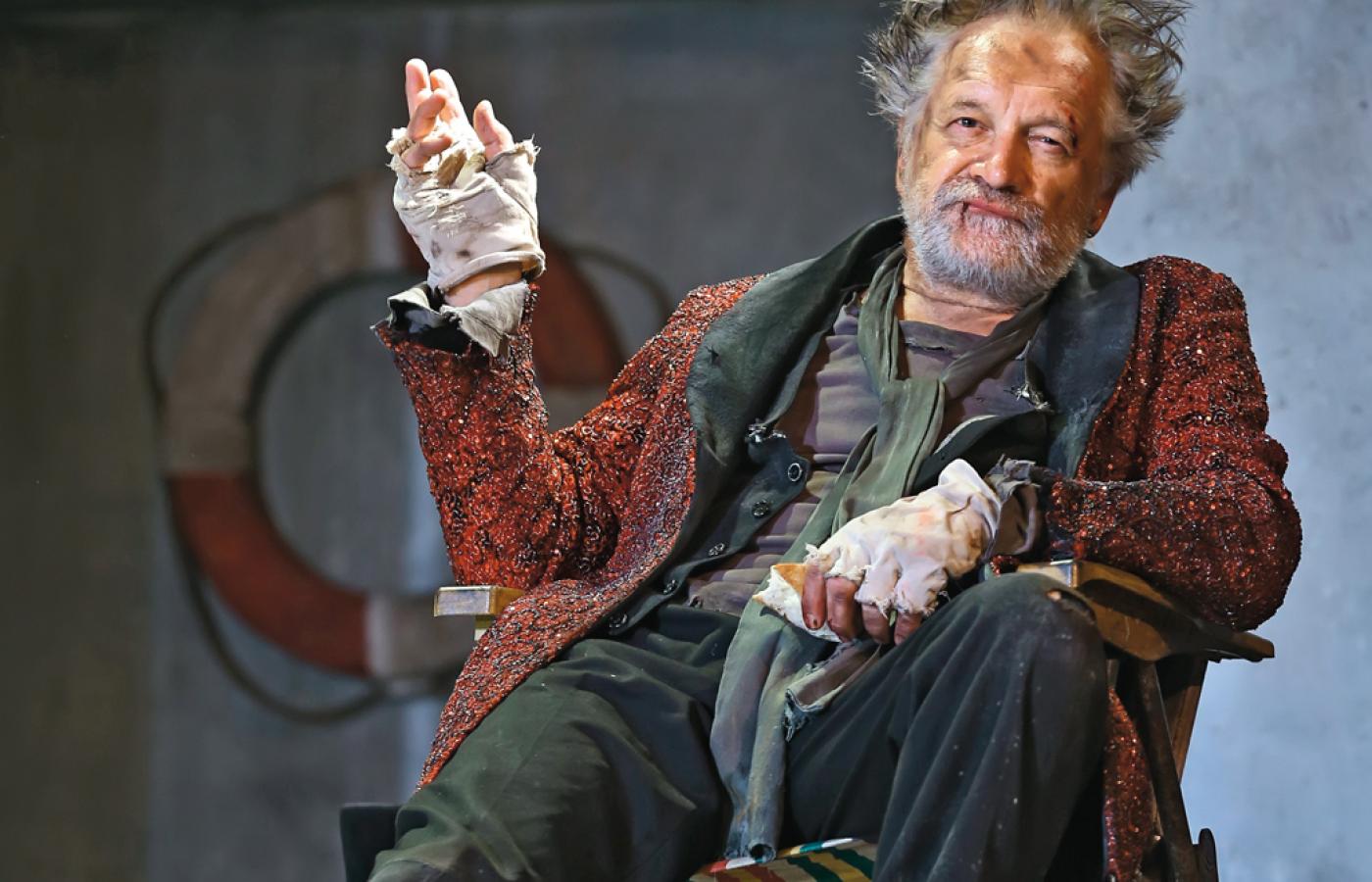 Prospero (Andrzej Seweryn) upija się whisky, Miranda z niebieskimi włosami (Anna Cieślak) i rapujący Ariel (Lidia Sadowa) chłepcą piwo z puszki, a czołgający się przez cały spektakl Kaliban (Piotr Cyrwus) ciągnie wino. W pijanym zwidzie ojciec „wyczaruje” córce historię ich ograbienia z bogactwa i pozycji przez występną rodzinę. Ta ostatnia pojawi się w formie postaci rodem z komedii slapstickowych z lat 20., w tle muzyka z ostatnich filmów Woody’ego Allena.