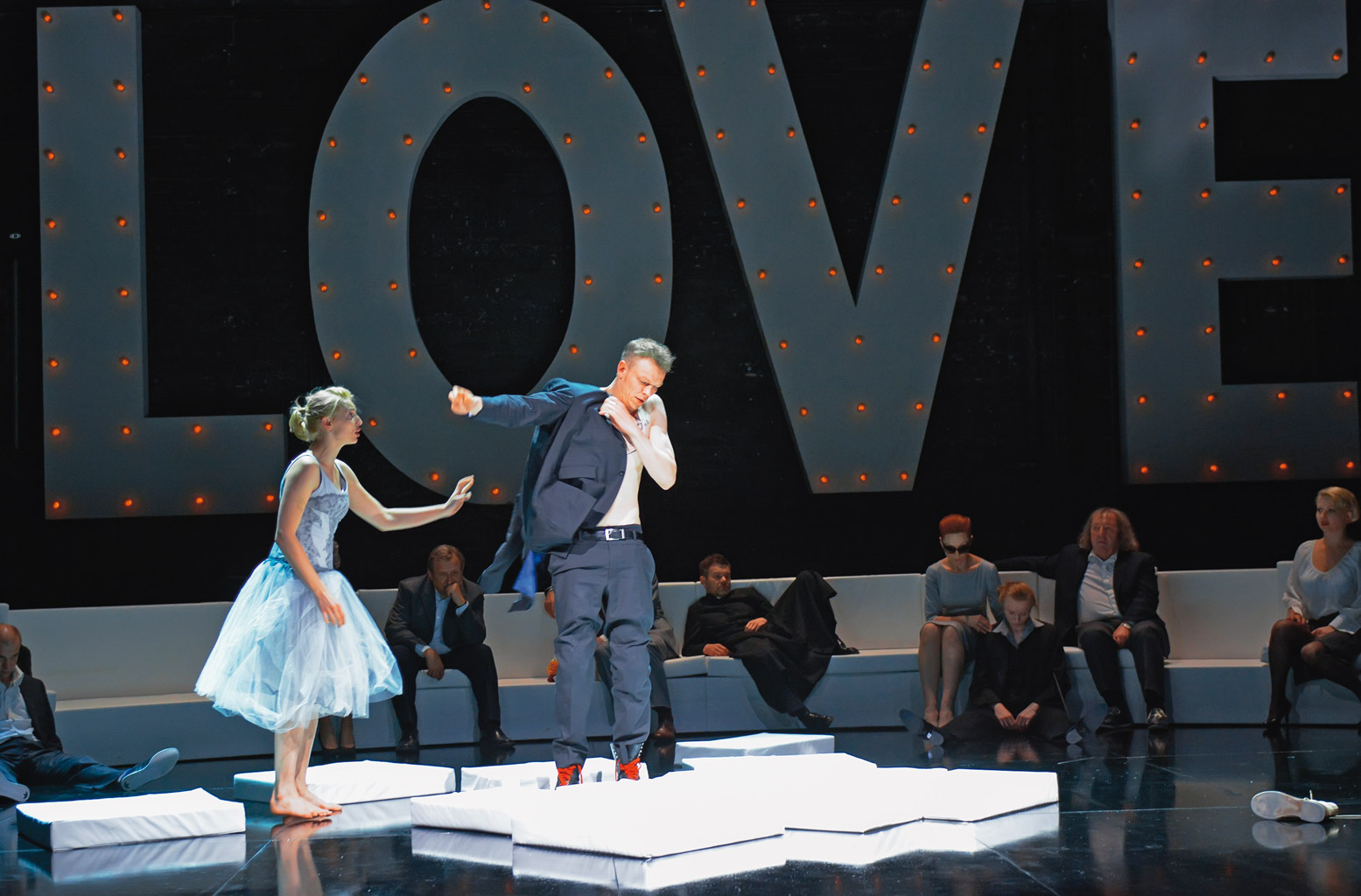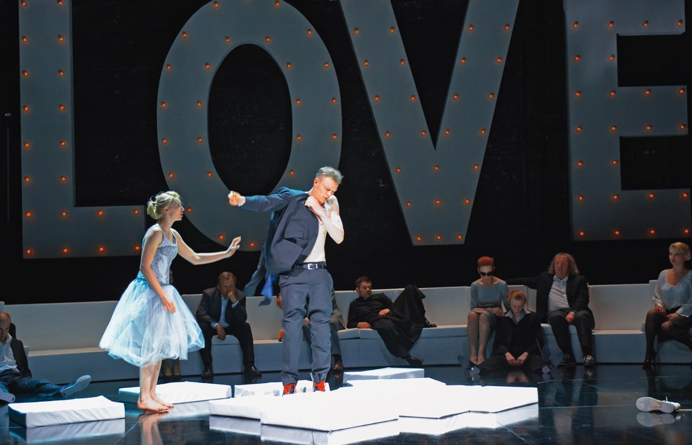 Na i wokół wielkiej kanapy pod monstrualnym neonem z napisem LOVE toczy się w Powszechnym opowieść o równie wielkim, popkulturowym micie idealnego uczucia, który od ponad czterystu lat, jakie minęły od premiery „Romea i Julii”, kształtuje obraz miłości w kolejnych pokoleniach. Aktorzy drzemią na kanapie, by w odpowiednim momencie wcielić się w role bohaterów miłosnej tragedii wszech czasów i zagrać je z komicznym przerysowaniem, bezradni wobec podkręconego przez popkulturę mitu, który stał się zbyt wielki, by móc podejść do niego bez zbroi ironii. Po wykonaniu zadania zmęczeni ponownie wpadają w letarg. To też obraz człowieka, który ma poczucie, że żyje tylko wtedy, gdy kocha. Miłość, najlepiej wielka, szalona i nieszczęśliwa, jest remedium na szarą codzienność.