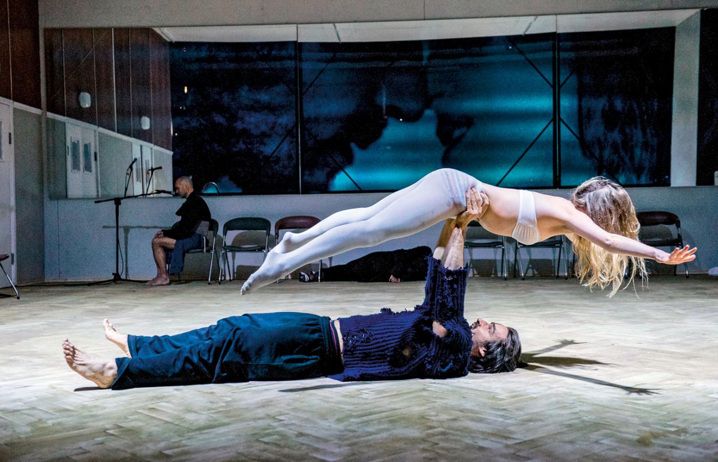 Scenografia odtwarza salę prób Teatru Żydowskiego. Zawieszone na tylnej ścianie lustra stają się ekranem dla projekcji wideo, przedstawiających dzisiejsze codzienne życie placu Grzybowskiego i okolic. Na ich tle Lea i jej najbliżsi przygotowują się do uroczystości weselnych. Chasydzi w tradycyjnych strojach śpiewają pieśni, brzmią mocno, dziko, nawet egzotycznie. Kiedy jeden z nich przechodzi obok lustra/ekranu, powstaje przejmujące wrażenie, jakby był jednym z przechodniów na współczesnej warszawskiej ulicy, naszym sąsiadem. Z boku sceny w Leę, w pięknym, na poły miłosnym akcie, wciela się duch jej zmarłego ukochanego. Był jej częścią, tak jak zamordowani żydowscy mieszkańcy byli częścią stolicy, i oni, i on, niepochowani i nieukojeni, wciąż gdzieś tu, pośród nas, są i każą o sobie pamiętać. Tak – mocno, transowo, przejmująco i wieloznacznie – zaczyna się „Dybuk”, klasyk literatury jidysz w reż. Mai Kleczewskiej, wystawiony na 65-lecie Teatru Żydowskiego i w przeddzień 72 rocznicy powstania w warszawskim getcie.