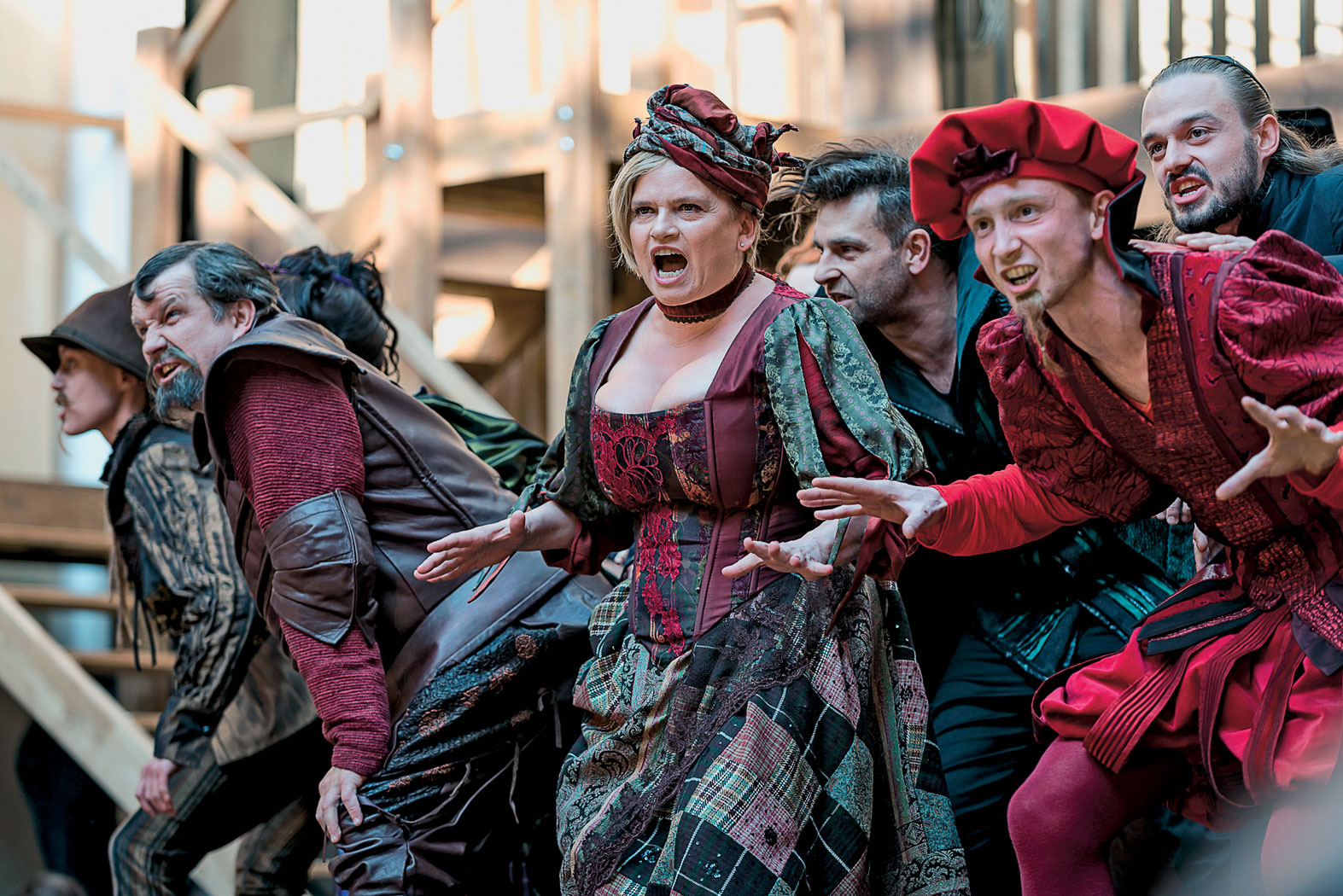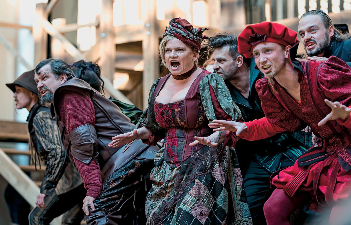 Na swoją pierwszą produkcję przygotowaną na scenę elżbietańską – nawiązującą do tej z czasów Szekspira, z placem gry otoczonym z trzech stron stojącymi widzami i spektaklami granymi pod gołym niebem, przy dziennym świetle – Gdański Teatr Szekspirowski wybrał „Wesołe kumoszki z Windsoru”. Niezbyt wyszukana komedia Szekspira, z akcją osnutą wokół damsko-męskich intryg: starań o rękę bogatej panny Anny i nauczki, jaką dają dwie kumoszki pewnemu szlachcicowi czyhającemu na sakiewki ich mężów, jest bardzo wakacyjną propozycją. Pomyślane jako wariacja na temat teatru jarmarcznego, ludycznego, przedstawienie jest rozgrywane na pustej scenie, nad którą wiszą rogi – niezbyt wyszukany symbol małżeńskiej zdrady. Operuje też grubym humorem i przerysowanymi postaciami: mąż zazdrośnik, ksiądz purysta językowy niewymawiający pewnych zgłosek (dobry Cezary Rybiński), służący o nazwisku Tuman (Marcin Miodek) czy porywczy medyk z Francji (Piotr Biedroń).