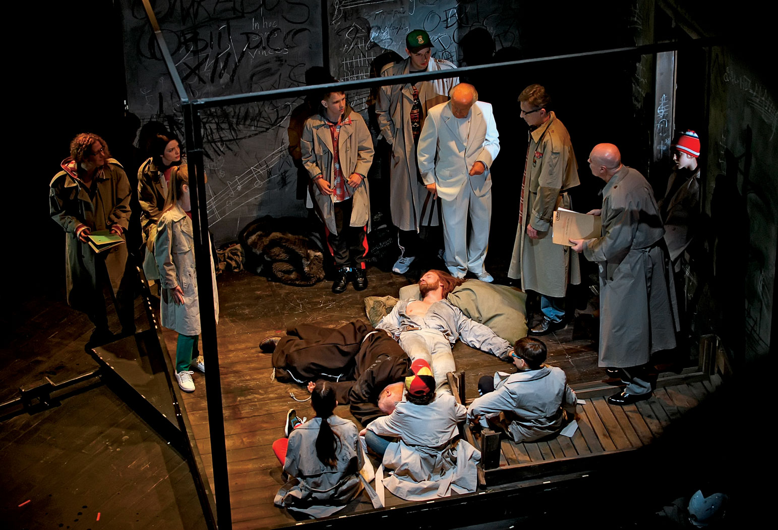 Plakat do spektaklu przywołuje warszawską inscenizację Kazimierza Dejmka z 1967 r. Słynną, bo zdjęcie jej z afisza przez komunistyczne władze wywołało studenckie protesty i stało się początkiem wydarzeń Marca ’68. To z jednej strony przypomnienie, jak ważnym w polskiej historii utworem są Mickiewiczowskie „Dziady” (oraz włączenie wrocławskiego spektaklu w ciąg historycznych inscenizacji dramatu), z drugiej zaś nieco ironiczne zwrócenie uwagi, że dzieło wieszcza zwykle było wykorzystywane do opowieści o współczesności, wyciągano wątki rezonujące z aktualną sytuacją, resztę pomijając. Michał Zadara, inscenizując całość tekstu, stara się wrócić do punktu zero, pokazać, że „Dziady” są i martyrologiczne, polityczne, i fantastyczne, satyryczne, ironiczne, i serio, o miłości do ojczyzny i do kobiety, o wierze i o pysze, o cierpieniu i o szaleństwie, a także o samotności i alienacji. Spektakl Zadary podąża za tym bogactwem form, tonów i treści, nie boi się też mocnych efektów, odwołań do popkultury, w czym jest wierny teatrowi epoki romantyzmu, który był rozrywką masową, przyciągał widzów także porywającą akcją i efektami.