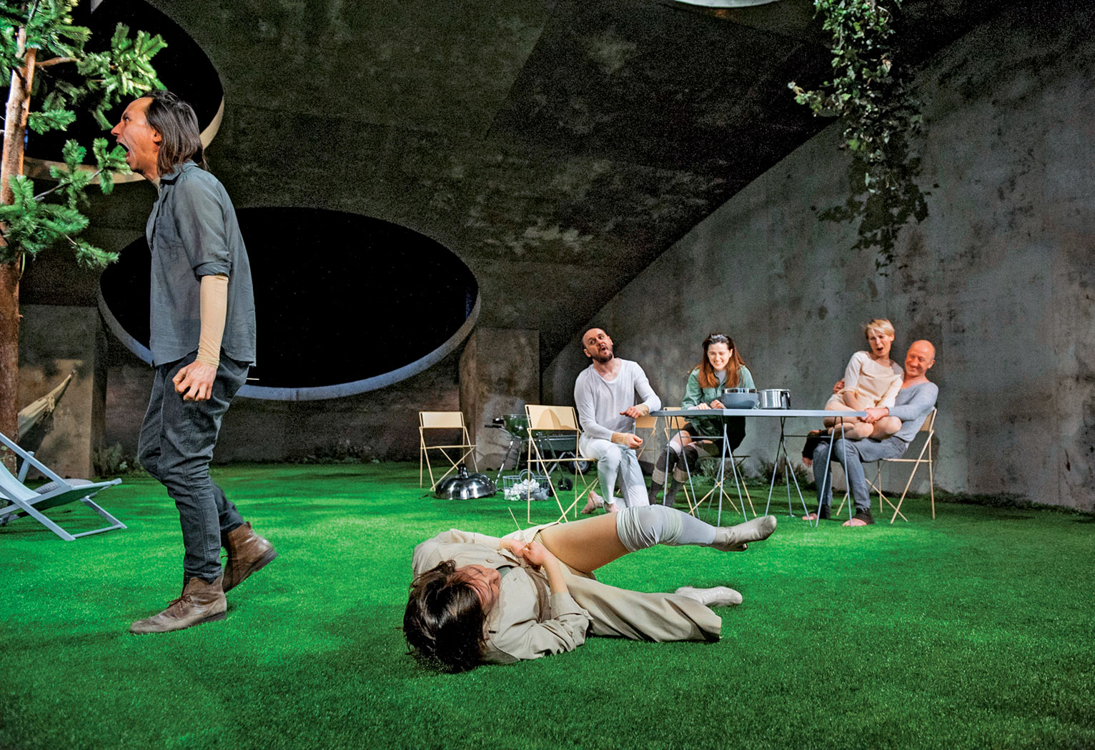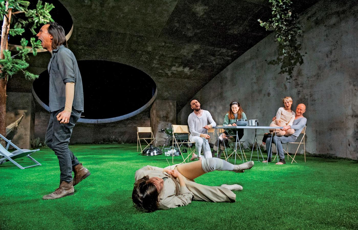 Gdyby wyciąć tekst, najnowszy spektakl TR Warszawa byłby piękną, intrygującą i zachęcającą do myślenia instalacją artystyczną. Zieleń trawy, świerki, ogrodowe fotele, akcesoria do grilla, a obok niepokojący beton. Jakby porozkładane na trawie gwiazdy TR, tym razem w towarzystwie gwiazd doproszonych, wypoczywały w pięknym, ale schronie. Na betonowej krawędzi – za nią ma być tytułowe jezioro – siedzi nagi Dawid Ogrodnik, na ścianie wyświetlany jest film z nagim mężczyzną – fragment performance’u Piotra Pawlenskiego, zarejestrowanego trzy lata temu na placu Czerwonym w Moskwie. A w tle słychać zapętlone odpowiedzi na pytanie, czego nie chciałbyś robić w chwili, gdy nadejdzie apokalipsa. Prawda, że intrygujące?
