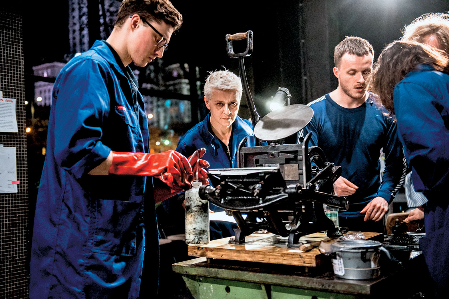Spektakl „Globalna wojna domowa” to niejako ciąg dalszy poprzedniego przedstawienia Wodzińskiego „Solidarność. Rekonstrukcja”. Tam pokazano współczesne konsekwencje zignorowania głosu robotników z pierwszej Solidarności, domagających się m.in. uspołecznienia zarządów w swoich zakładach pracy i budowy społeczeństwa obywatelskiego. Tu rzecz dzieje się pomiędzy maszynami drukarskimi – symbol pojemny, bo pomieści i skojarzenia z klasą robotniczą, ofiarą procesów globalizacyjnych, i z rozprzestrzenianiem się propagandy, a także każe myśleć o pozycji mediów w kapitalizmie. Aktorzy w granatowych fartuchach odgrywają manifesty i mowy symbolizujące kolejne ideologiczne kroki, które doprowadziły nas do dzisiejszych rządów prawicowych populistów. Od eseju Miltona Friedmana z 1979 r. – o globalistycznym charakterze gospodarki i działaniu wolnego rynku (na przykładzie ołówka, którego każda część pochodzi z innego rejonu świata), przez Margaret Thatcher objaśniającą dogmaty neoliberalizmu: społeczeństwo nie istnieje, są tylko jednostki. Warren Buffett tłumaczy, że USA to nie jest kraj dla biednych ludzi, Bernard Madoff nieszczerze przeprasza za defraudację miliardów dolarów, Oriana Fallaci i Samuel Huntington ogłaszają zderzenie cywilizacji, do tego Nowa Prawica z Francji i przedstawiciele nowych ruchów tożsamościowych oraz sprawca masakry w szkole w Columbine. A na końcu Donald Trump i wiwatujące na jego cześć tłumy. Prawicowy populizm i ruchy tożsamościowe jako reakcja na korupcję i kryzys globalnego kapitalizmu.