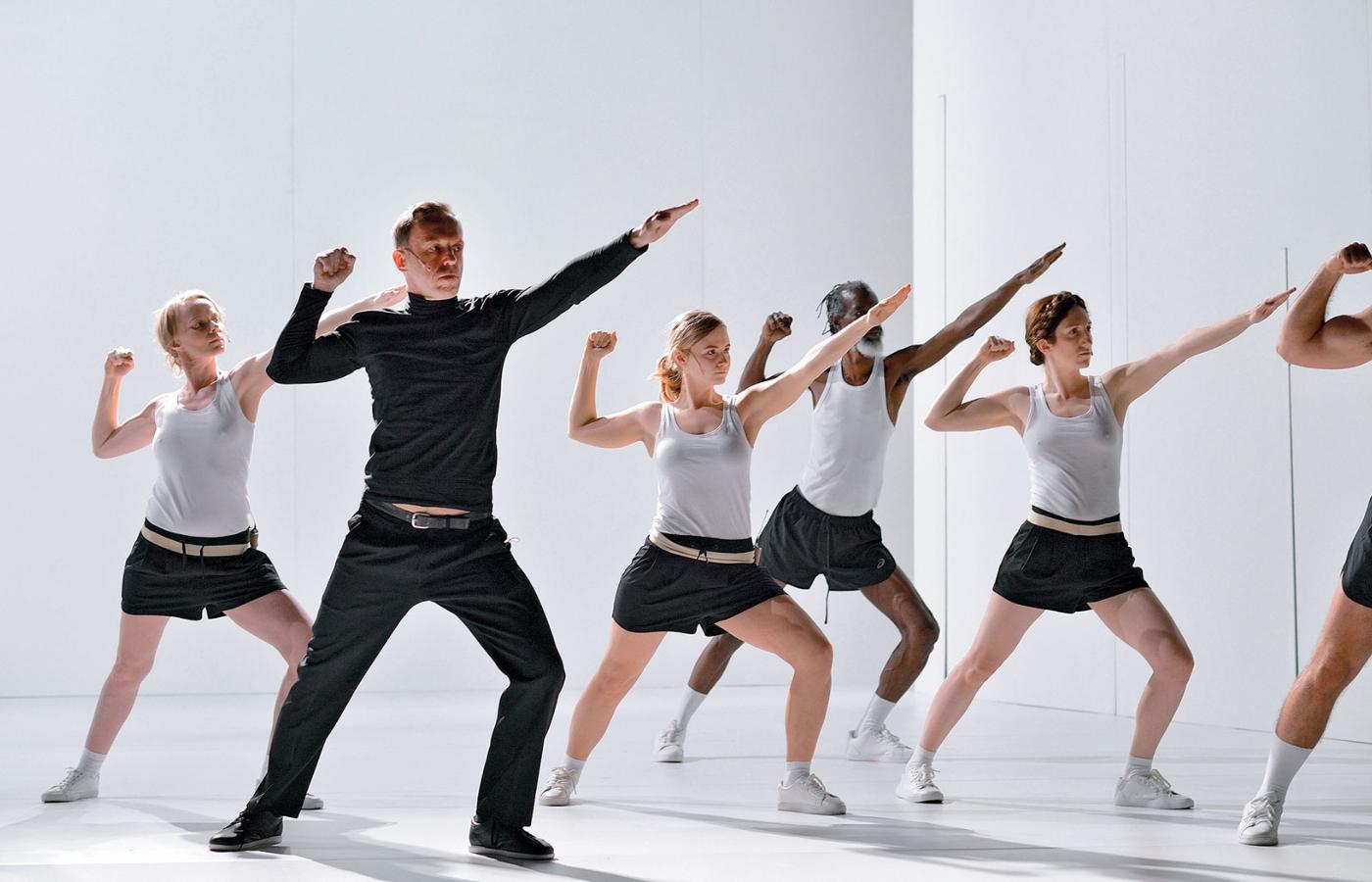 Twórcy wybrali fragmenty brzmiące w dzisiejszej Polsce (ale nie tylko u nas) znajomo i pytają, dokąd zmierzamy w 80. rocznicę wybuchu wojny. Groteskowo-farsowy wstęp jest ostrzeżeniem: schodzimy do kloaki. Tyrady o „zdrowym” antysemityzmie, niezdrowej nowoczesnej sztuce, rasie dobrej i złej wygłasza rodzina z klasy średniej przy niedzielnym obiedzie. Do którego łaskawym gestem zaprasza, upokarzając na wszelkie sposoby, emigranta. Krytyka demokracji i pochwała systemu wodzowskiego są wyśpiewywane na modłę operową przez aktorów z kartonowymi karykaturami współczesnych przywódców. Mądrości o budowie silnego białego narodu, z patriotycznym przykazem rozmnażania oraz kobietami jako „stroną pasywną”, aktorzy wygłaszają w przerwach między kolejnymi kopulacjami. Skuci łańcuchami, niczym w jakimś strasznym zoo czy cyrku. Hitler i jego idee bywały materiałem dla komedii, farsy, groteski. Spektakl z Powszechnego – wspaniale grany przez Klarę Bielawkę, Aleksandrę Bożek, Arkadiusza Brykalskiego, Mamadou Góo Bâ, Natalię Łągiewczyk i Oskara Stoczyńskiego – nie żartuje i nie bawi. On przeraża i smuci.