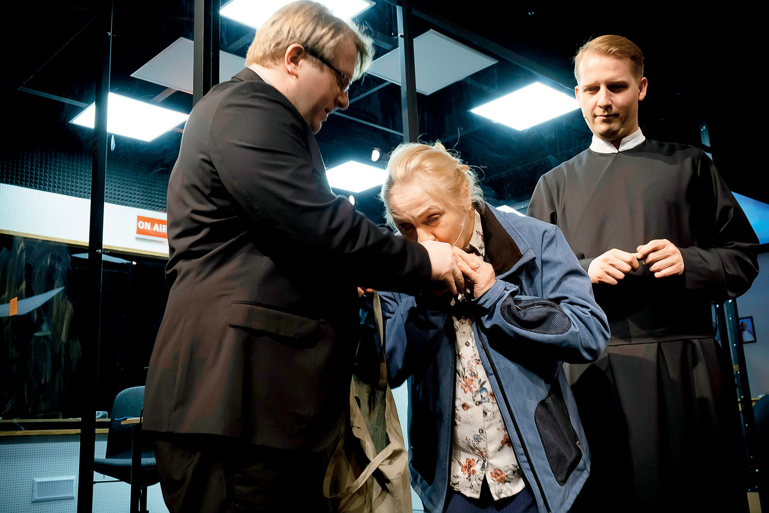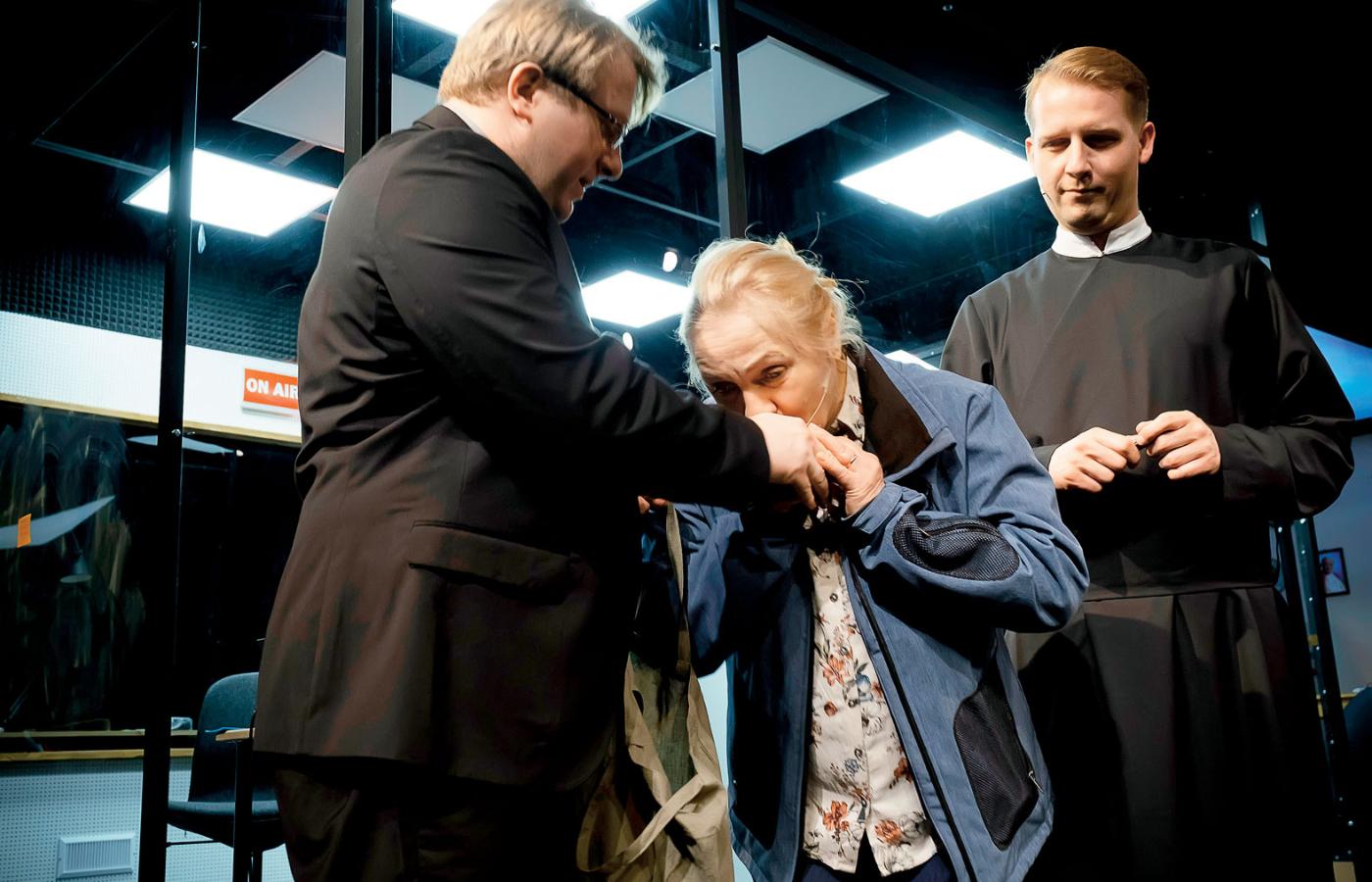 Studio Radia Tysiąca Wzgórz w Rwandzie, którego prezenterzy walnie przyczynili się do ludobójstwa na Tutsi dokonanego w 1994 r. przez ich sąsiadów z rządzącego plemienia Hutu („zgnieć karalucha”) – staje się studiem toruńskiego Radia Maryja. Z podobną retoryką („Wiecie co się robiło ze zdrajcami w czasie wojny…”) i Żydami, feministkami i „lewactwem” w roli „wrogów i zdrajców Polski”. Prokurator Carla del Ponte, oskarżająca w procesie o ludobójstwo w Rwandzie, opowiada o sprawczej roli w masakrze, księży i zakonnic i o ochronie, jaką potem dał im Kościół. Wspierający też ustami kolejnych papieży Radio Maryja. Ojca Tadeusza (Filip Perkowski) oglądamy w różnych odsłonach: targi z politykami, uwodzenie słuchaczy, ale też widzów w teatrze, dla których gra na gitarze „Schody do nieba” i tłumaczy, że odbiera strach, daje nadzieję i siłę.