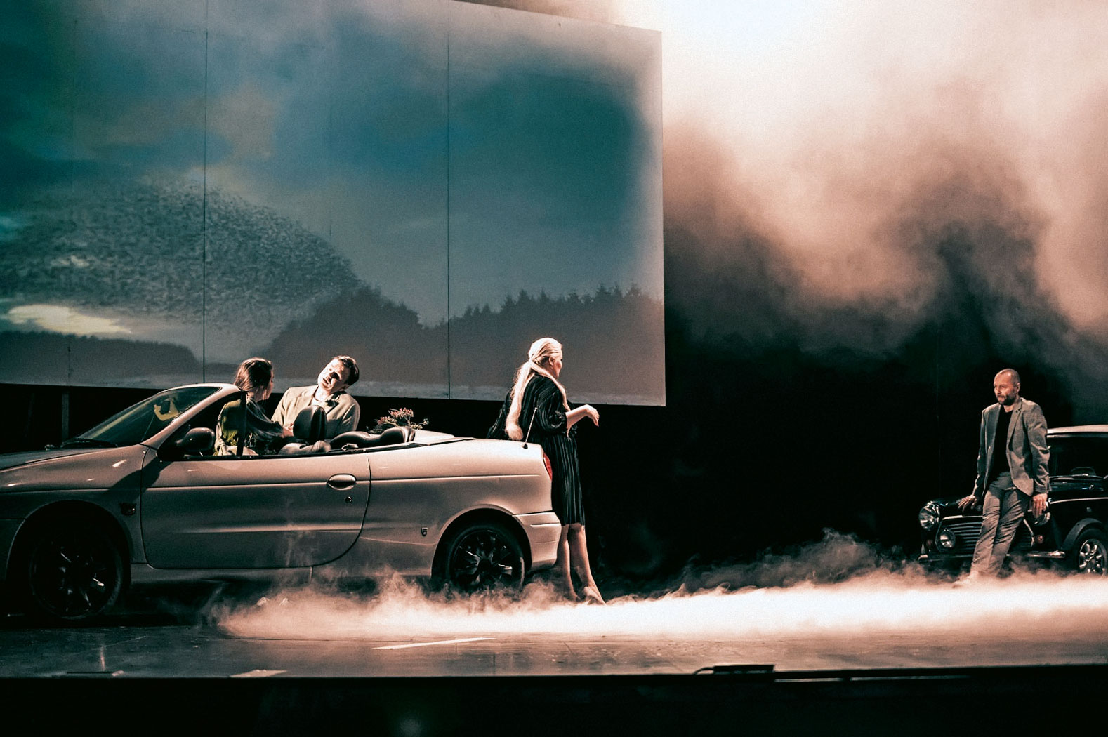 „Eugeniusz Oniegin” Czajkowskiego to w oryginale duża, trzyaktowa opera. W Szczecinie stała się kameralnym dramatem z jedną przerwą, trwającym w sumie godzinę. Zamiast pałaców i balów jest zakręt na szosie, przy którym stoją dwa samochody, a nad nimi ekran wyświetlający ruchomy krajobraz. Tu rozgrywa się cała akcja – bohaterowie przychodzą i odchodzą, zakręt staje się symbolem.