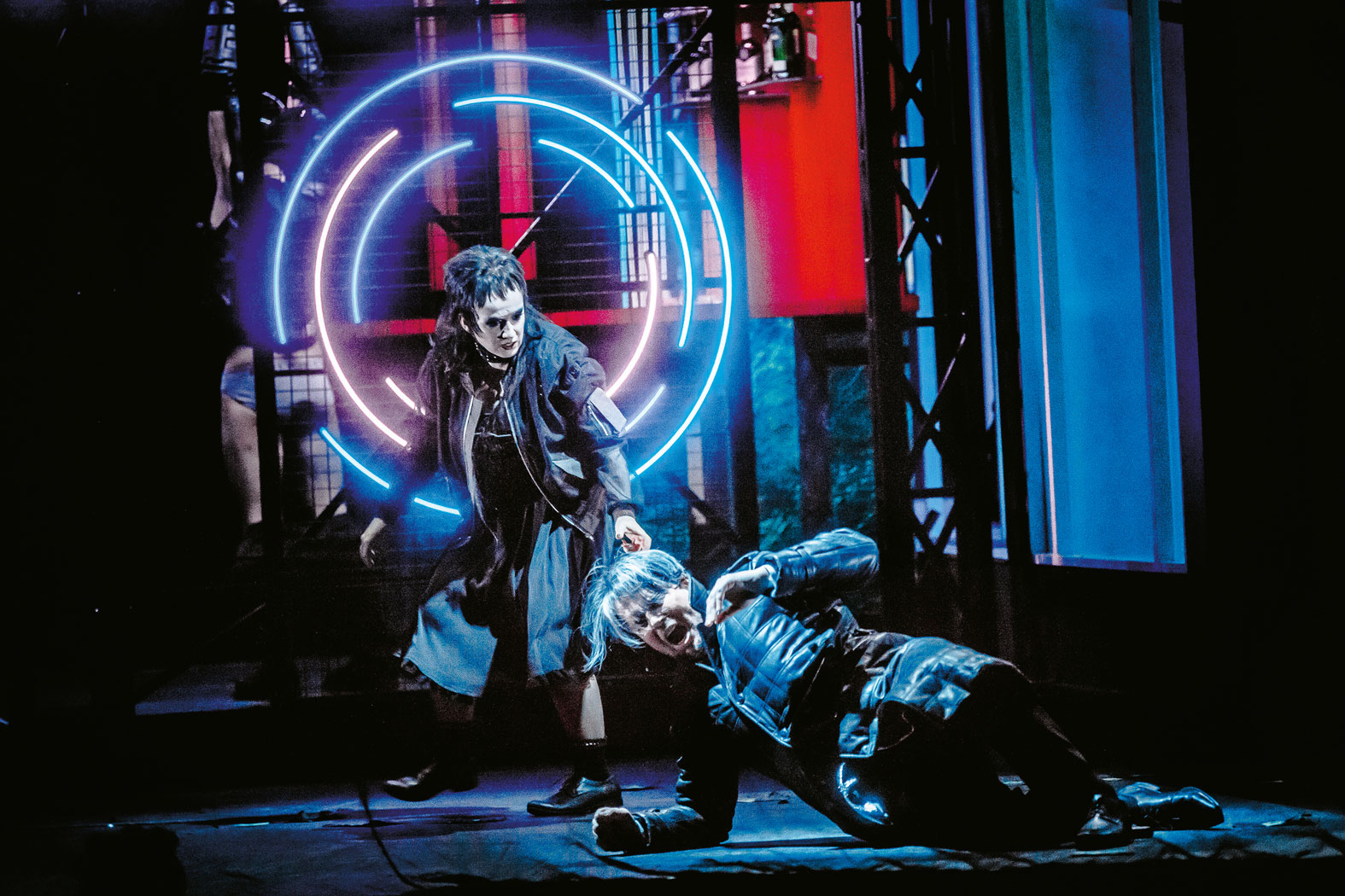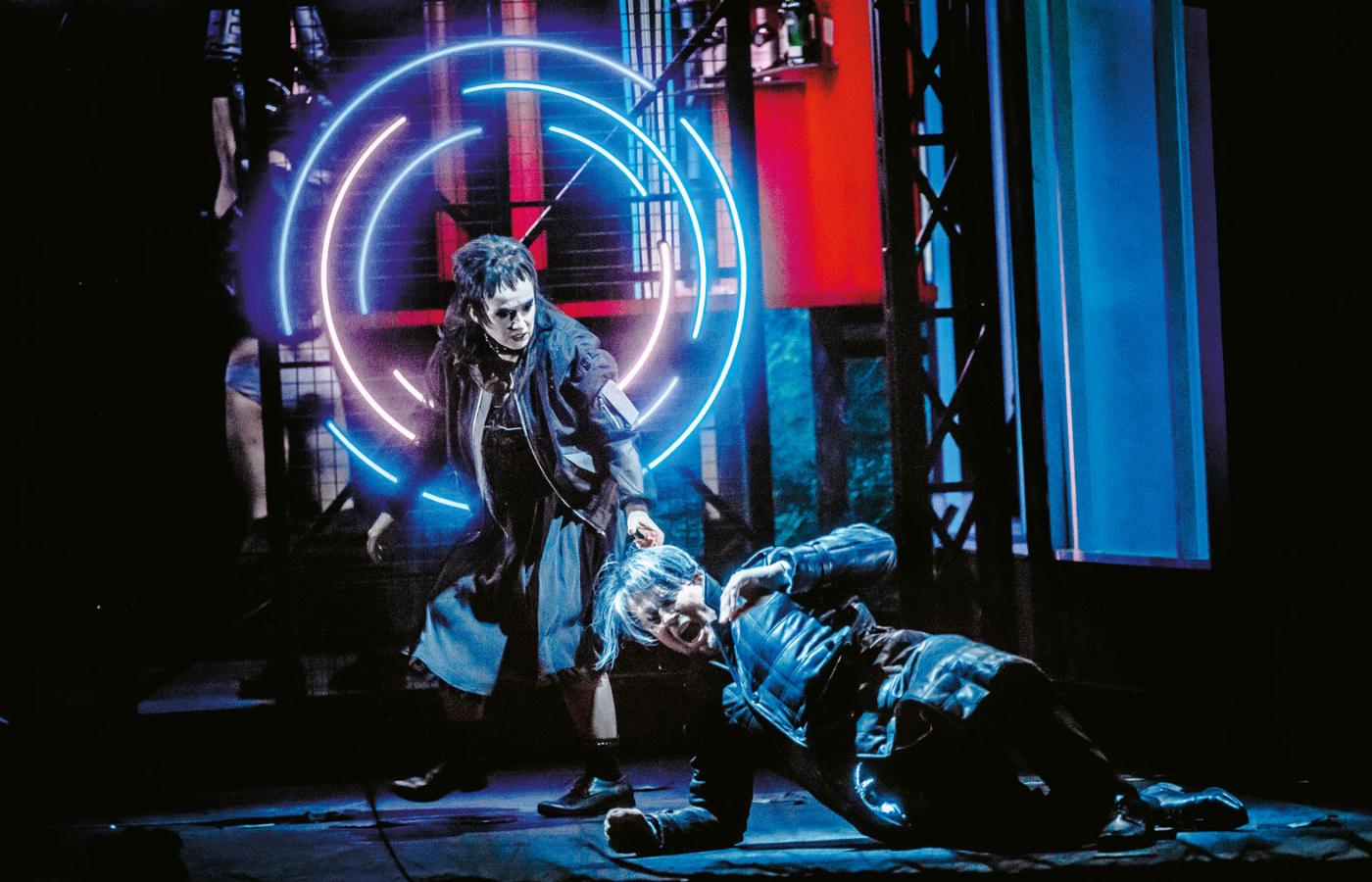 Gdyby opisać jednym zdaniem ten spektakl, można powiedzieć: ten sam Treliński, tylko bardziej. Jest tu znów piętrowa konstrukcja na scenie obrotowej, projekcje i efekty świetlne, motywy z innych realizacji – neony, bar, białe pomieszczenie z żaluzjami, różowa kanapa. Ale wszystkiego jest więcej, projekcje pokazywane są w wielu małych okienkach, wizje w poszczególnych pomieszczeniach coraz bardziej fragmentaryczne, pojawiają się anonimowe postaci o świecących twarzach robotów. Dystopijne miasto Paris Sinai wybudowane przez Borisa Kudličkę (scenografia) i Bartka Maciasa (projekcje) to świat, w którym wszystko jest anonimowe i obce, są szalone emocje, ale nie ma empatii. Świat, który ma wiele wspólnego z dzisiejszym.