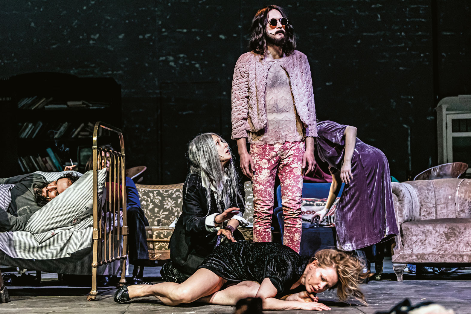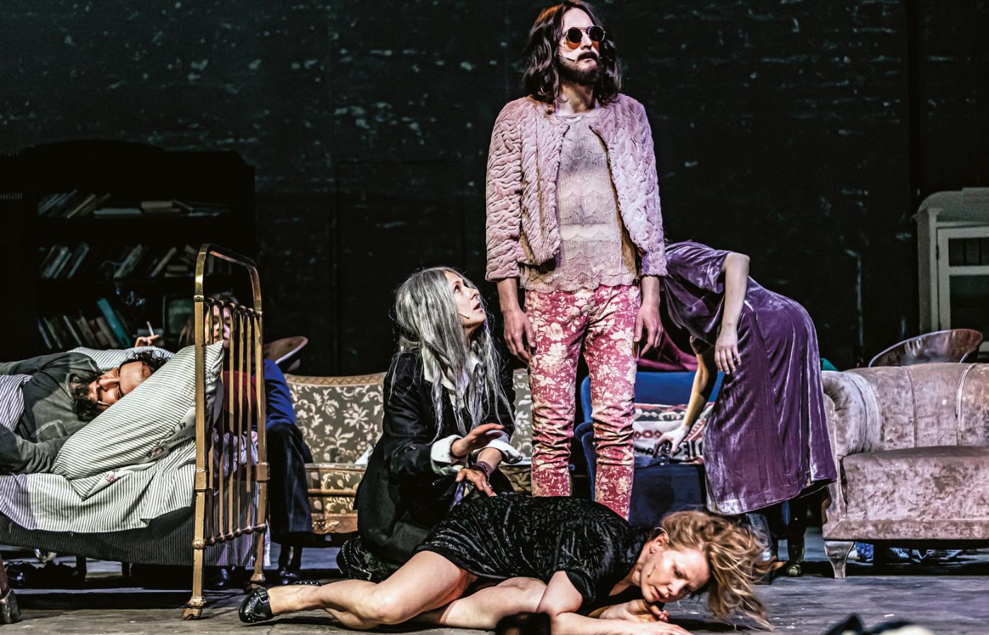 W „Imagine” Krystian Lupa wraca do piosenki Johna Lennona i do hipisowskich ideałów świata miłości i tolerancji, bez podziałów i bez wojen. Kontekstem jest biografia reżysera, który w młodości był hipisem oraz rosyjska napaść na Ukrainę, rosnący na Zachodzie w siłę faszyzm i pytanie, które pada wielokrotnie ze sceny: co spierdoliliśmy? Pierwsza część ponadsześciogodzinnego spektaklu dzieje się w ulubionej przestrzeni Lupy, czyli w pokoju/jaźni/zaświatach, do którego na wezwanie guru (Grzegorz Artman i Andrzej Kłak) dawnej hipisowskiej komuny zjawiają się po latach jej członkowie/widma/ikony kontrkultury. Imię guru – Antonin – to nawiązanie do Antonina Artauda, artysty totalnego, a jego goście to m.in. powidoki Janis Joplin (Karolina Adamczyk), Patti Smith (Marta Zięba), Susan Sontag (Anna Ilczuk) i Timothy’ego Leary’ego (Julian Świeżewski). A „jeden nie przyszedł, bo siedzi w parlamencie”, co jest aluzją do Ryszarda Terleckiego, w środowisku krakowskich hipisów znanego jako „Pies”.